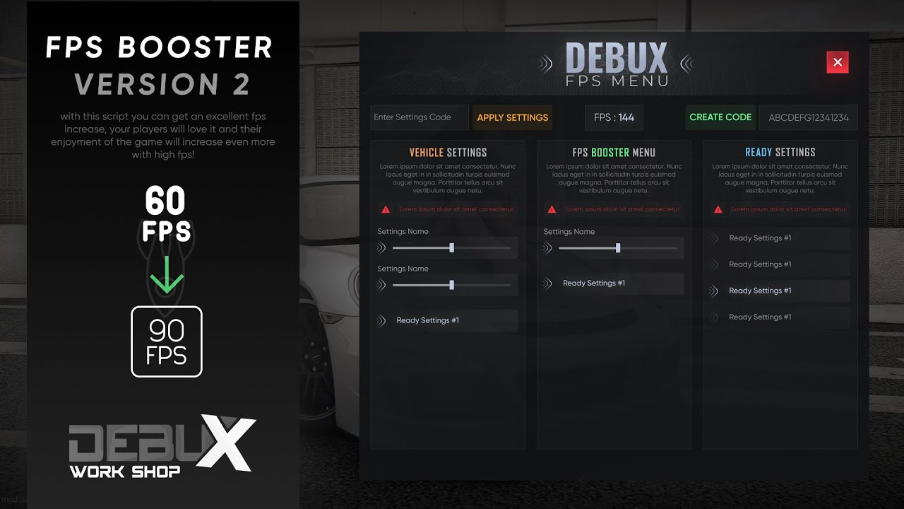 with this script you can get a perfect fps boost your players will love it and their enjoyment of the game will increase even more with high fps it is one of the most detailed fps menus on the market and tested with +200 players for the most perfect fps boost.
