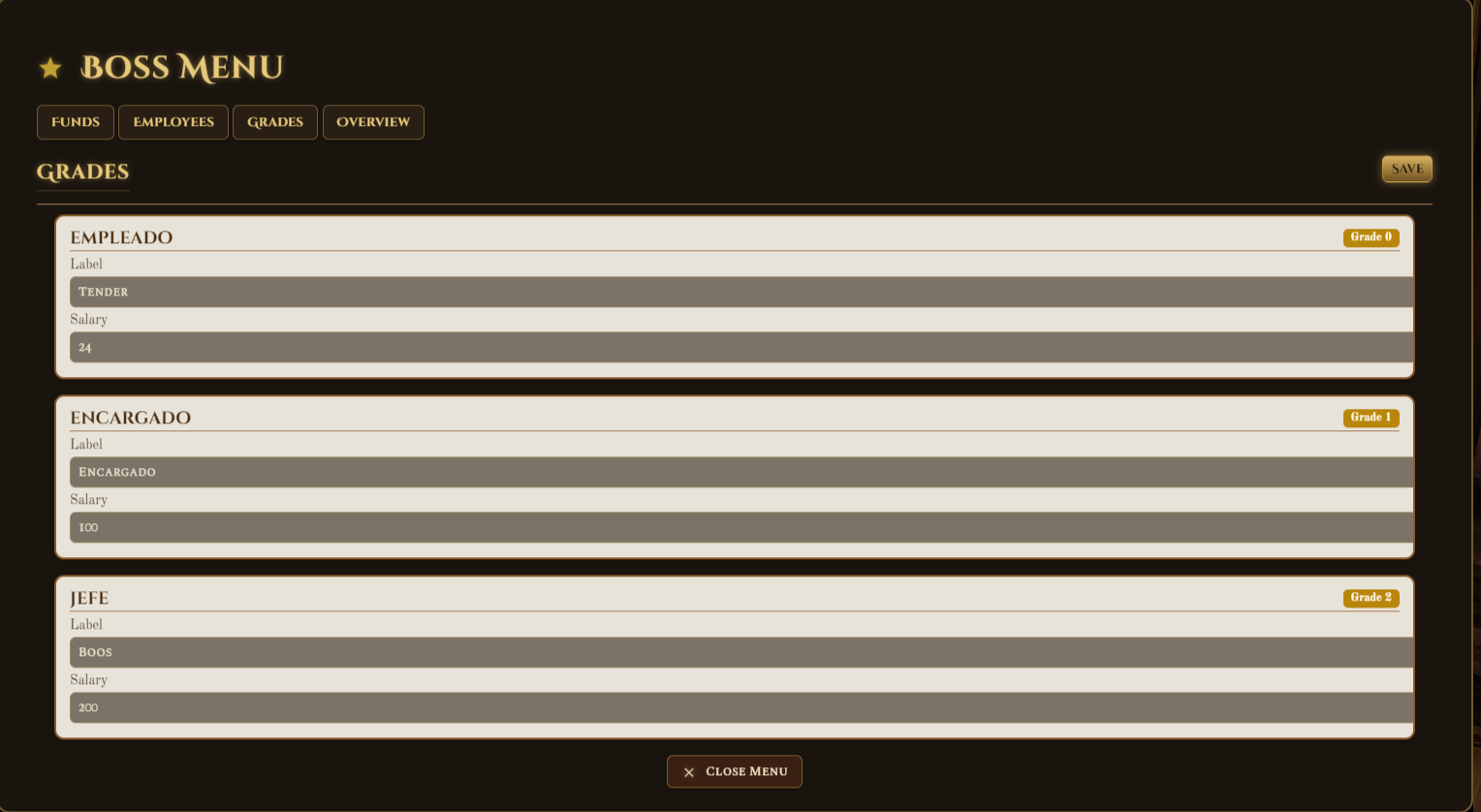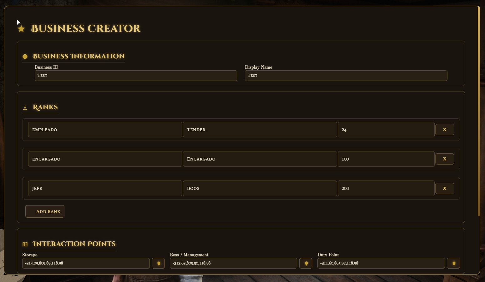 Set business names, labels, grades, storage points, boss menus, duty spots, doors, and more.