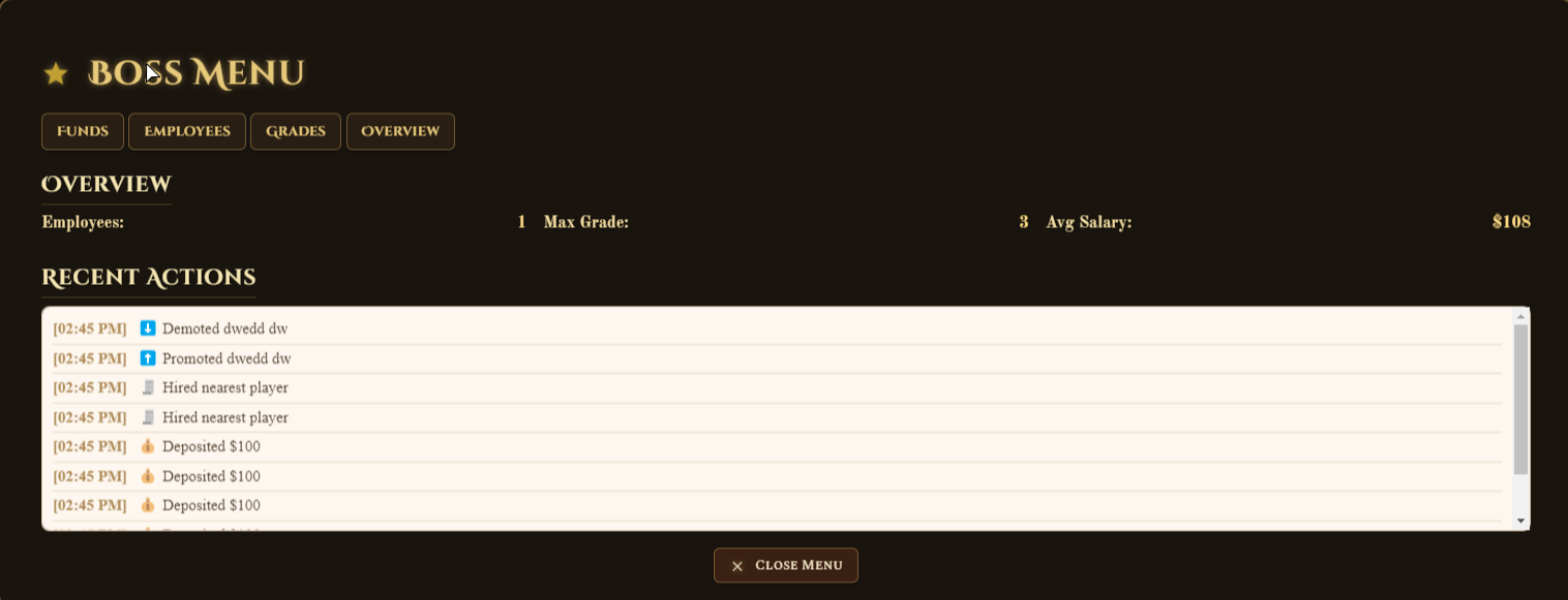 Manage employees, society funds, grades, and statistics directly from an intuitive visual panel.