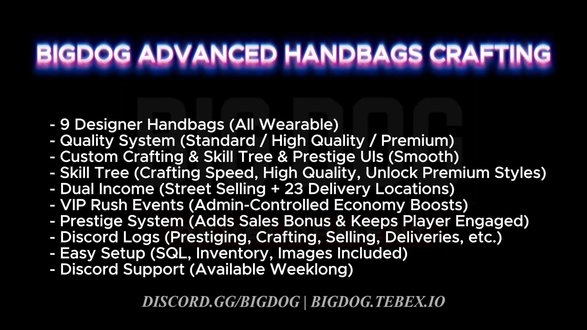 Take your RP server to the next level with Bigdogβs Advanced Handbag Crafting β a one-of-a-kind luxury fashion business script!