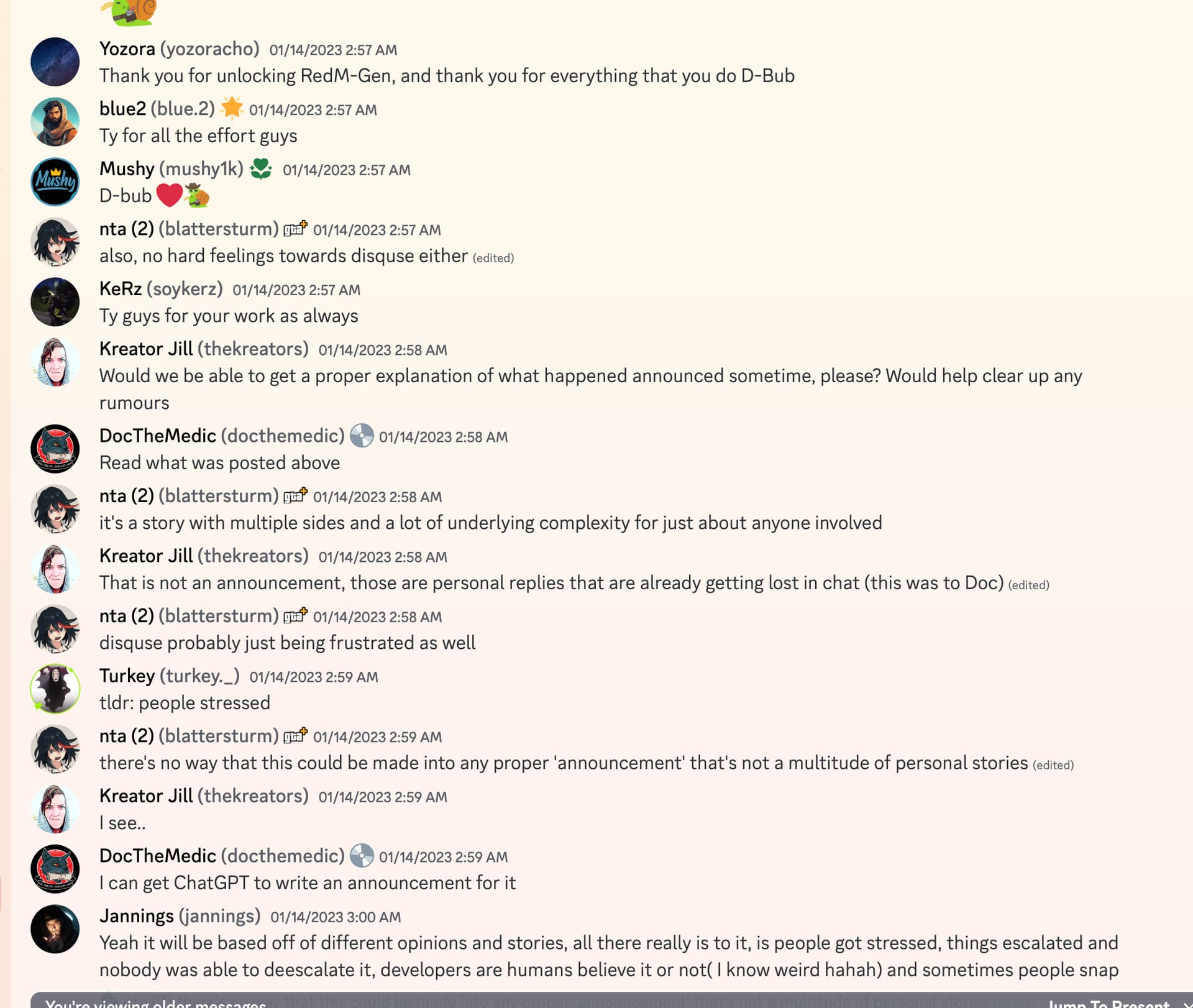 Cfx and FIveM are no longer beholden to you and that is for the better. It will be a more positive and healthy environment without you in a position of authority (though to your points, I still question why you’ve been allowed to continue as a moderator). Cfx and Rockstar still have their issues overall, but at least this last six months has been peaceful.