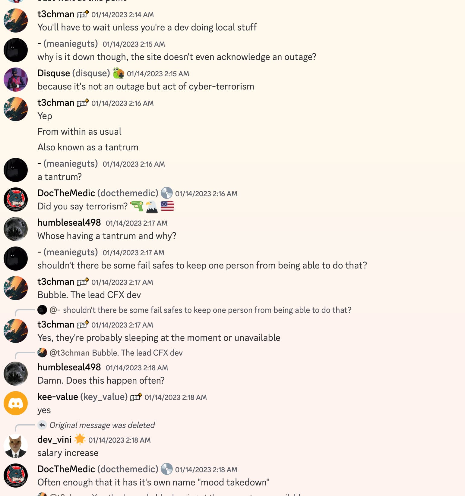 From a discussion in redm-general around probably one of the largest incidents you might’ve been referring to (i.e. the time RedM was disabled after some RedM change was causing some additional stress in an already-bad period where most of the team also was somewhat unavailable, or, at worst, causing additional escalations by being passive-aggressive - see the phrasing ‘chewed out internally’ used here):