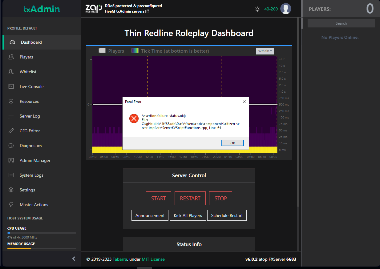 When anyone trys to join my server the server crashes and we get this error. Ive tried deleting all resources and reinstalling it all, updating server artifacts, and messing with texture sizes in vehicle ytds. Nothing has seemed to work. I am currently attempting to reinstall FiveM to see if that fixes it. But Im not to confident on that
