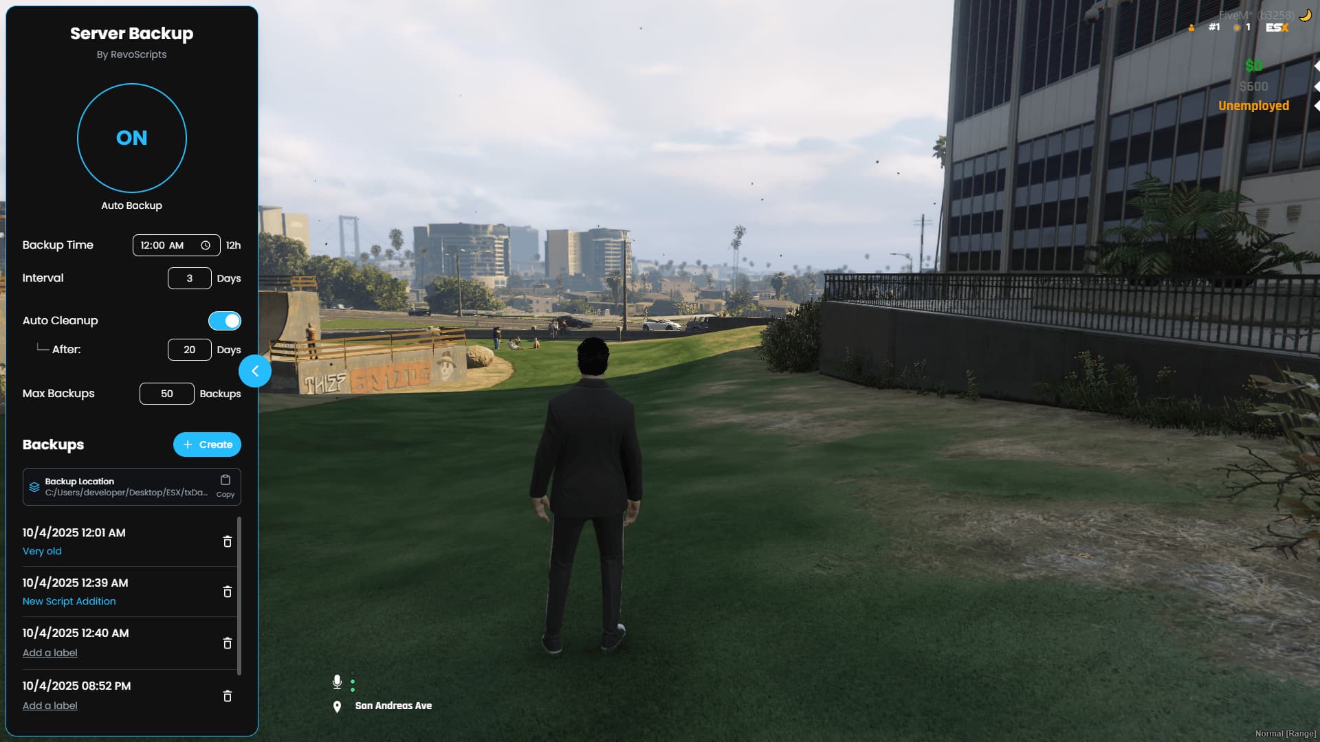 Regarding full server file backups: our original idea did include server files (resources, configs, etc.), but unfortunately FiveM doesn’t allow scripts to access or read files outside their own (root) folder, so it’s technically impossible due to platform restrictions.