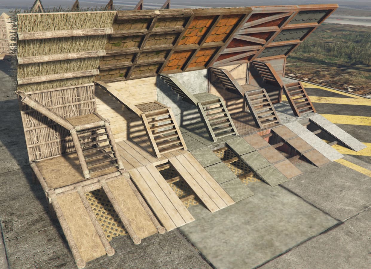 Every single one of these comes in 5 material tiers – Twig, Wood, Stone, Metal, and HQ Metal – each with its own unique model and textures. Players can place, snap, upgrade, downgrade, and raid everything. It works like you’d expect if you’ve played Rust.