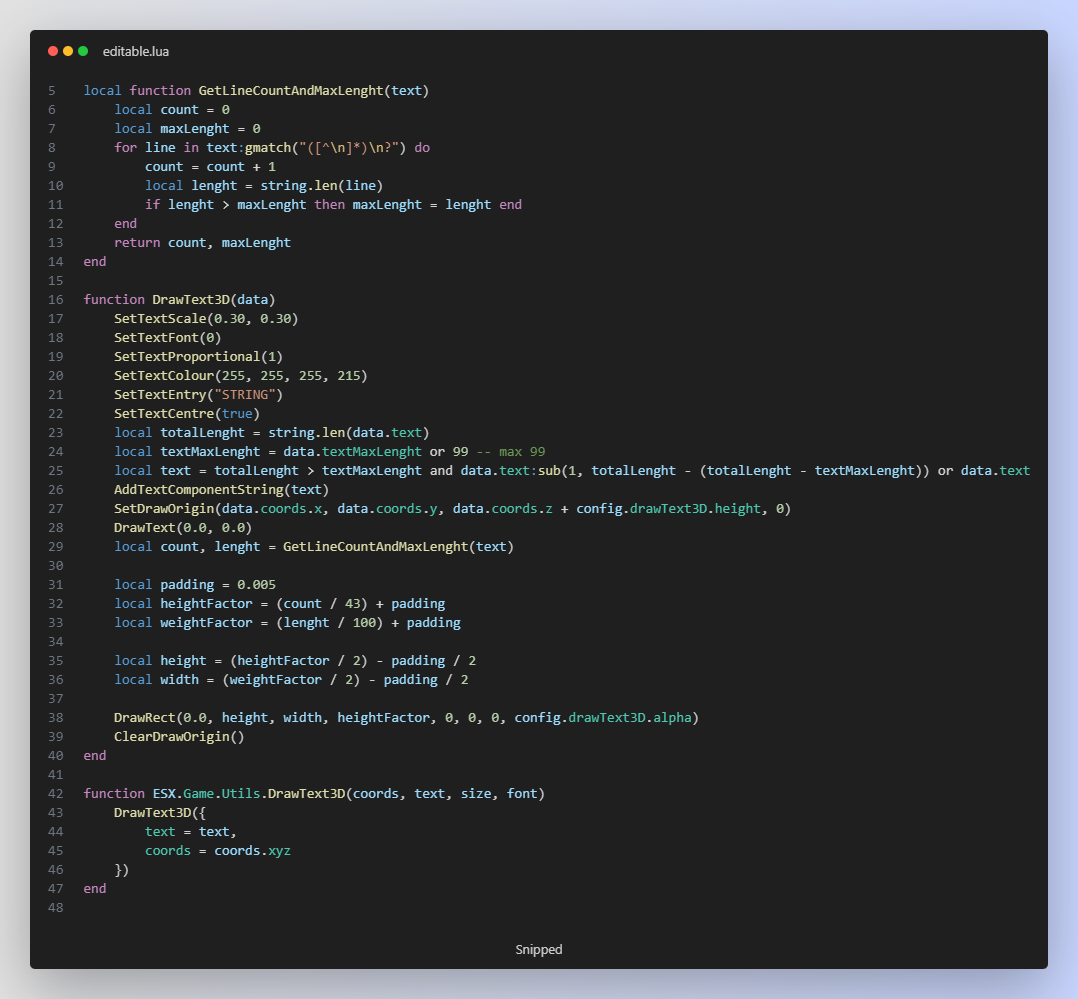 ESX.Game.Utils.DrawText3D(coords, text, size, font)