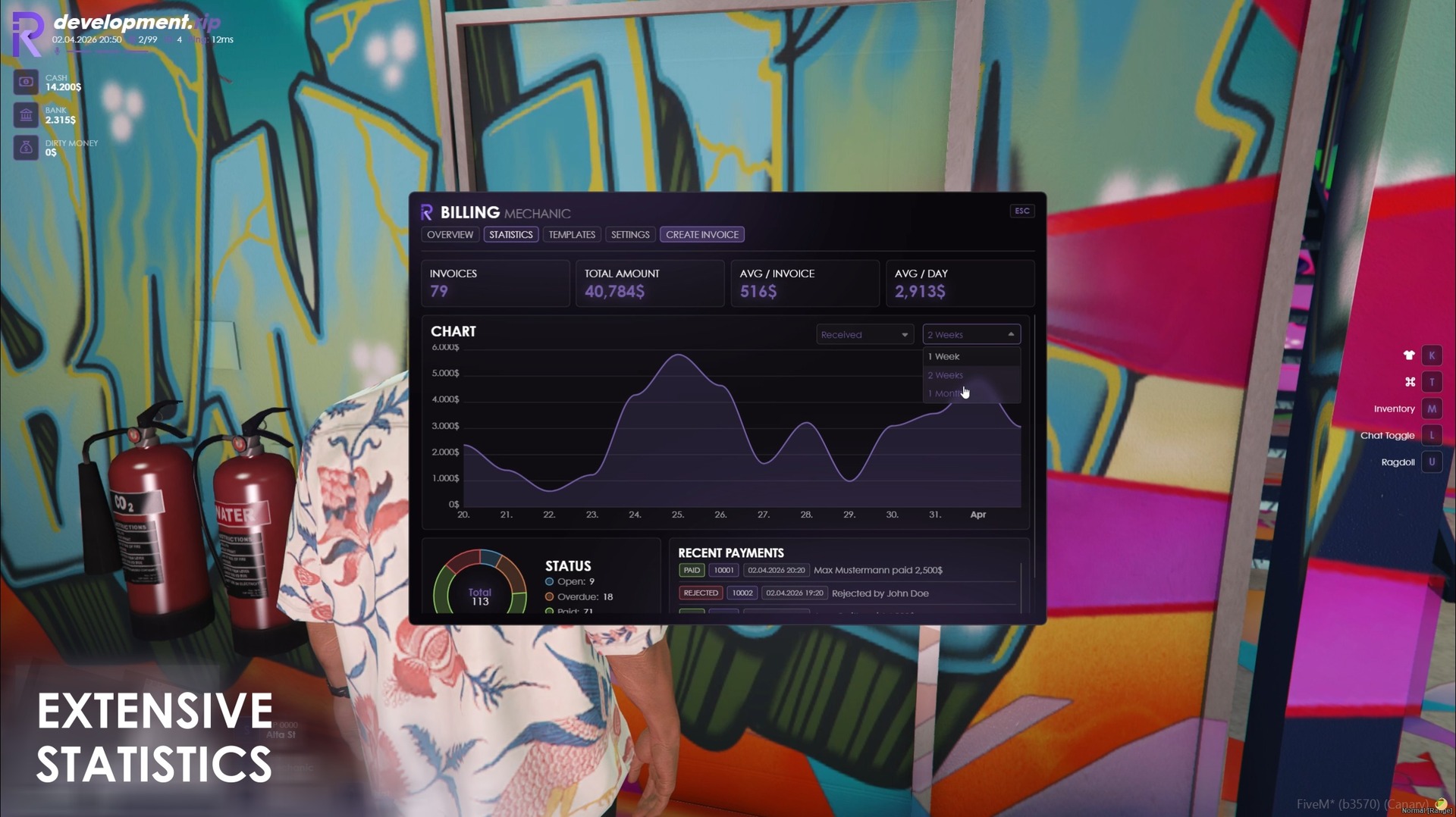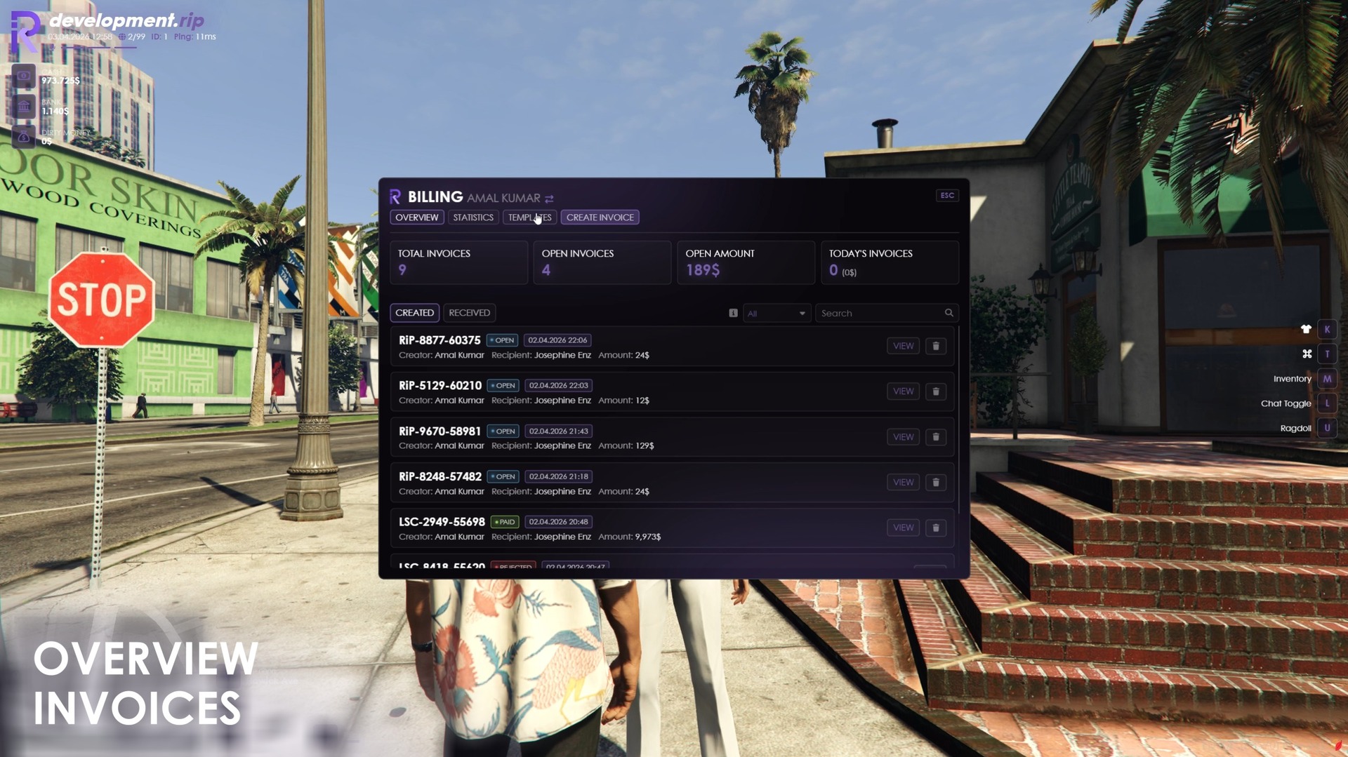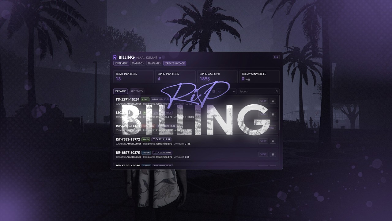 Bring professional invoices to FiveM! Create private or business invoices, track statistics and handle overdue payments with a full featured billing system.
