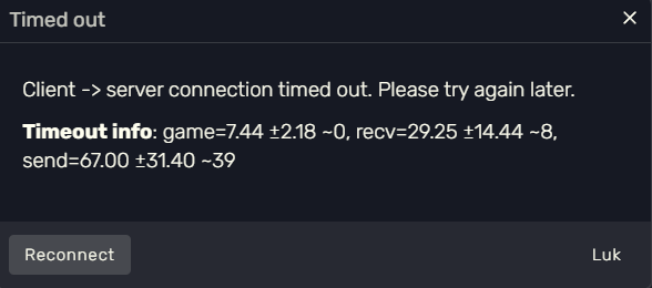 Hello whenever i try to join a server my screen gets black after the loading screen then after some time i get kicked and it says Client → server connection timed out. Please try again later.