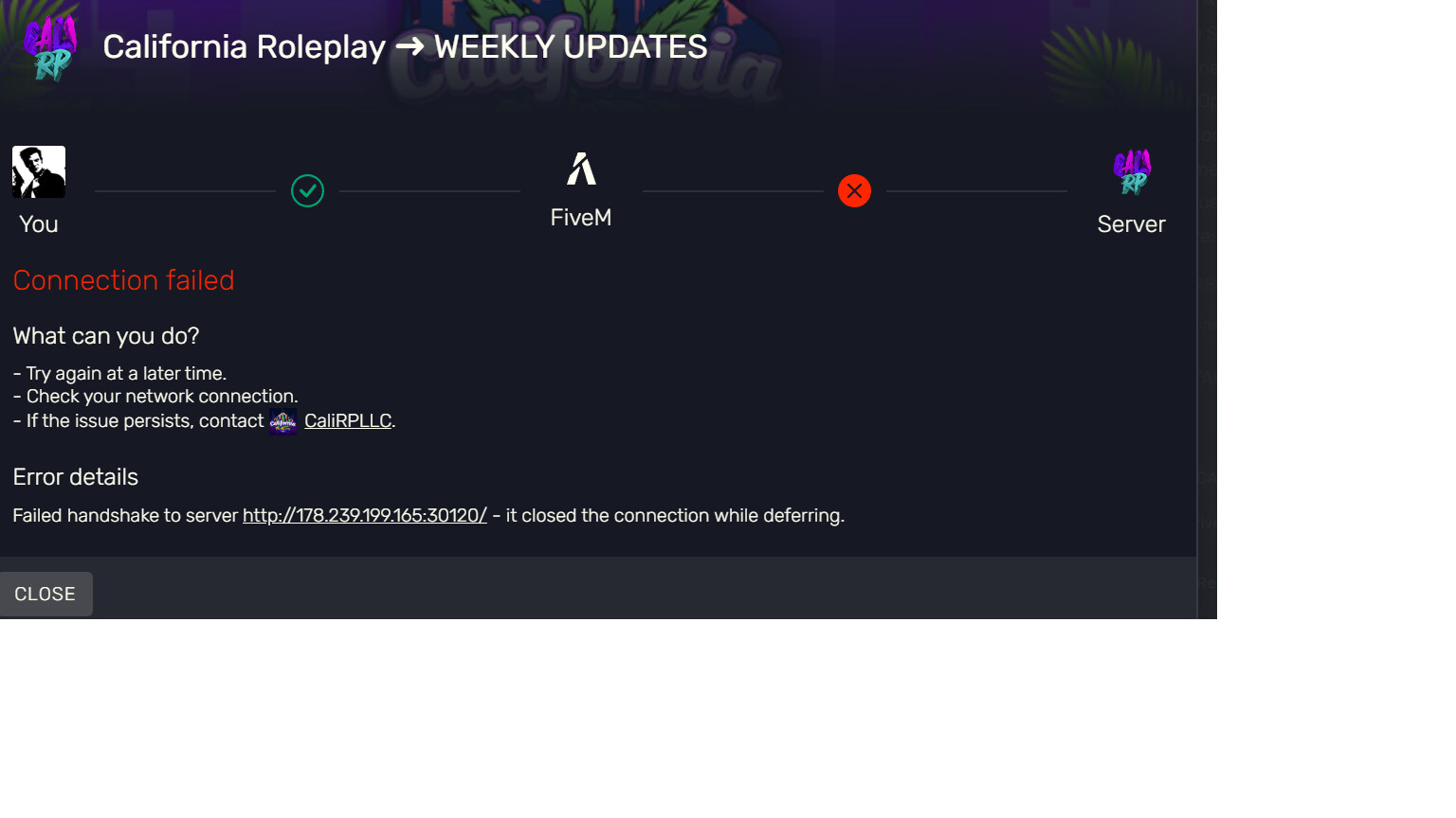 I have tried reinstalling fivem, using a vpn, and unplugging my router then plugging back it back in. I get a “failed handshake error”. Has been happening for days now.