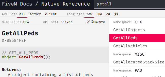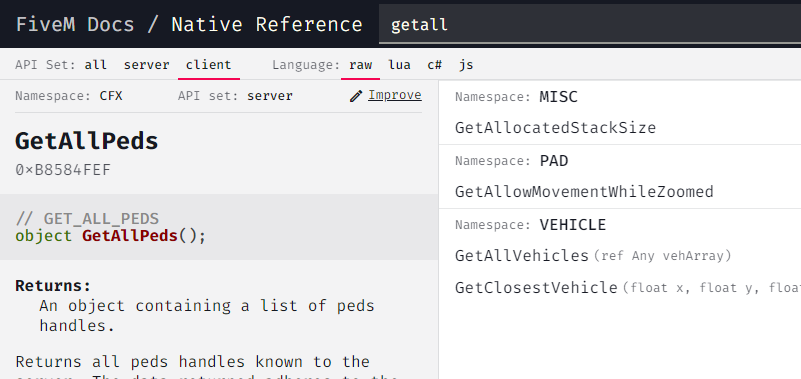 When I click “client” in the API Set selector the GetAllPeds function disappears.