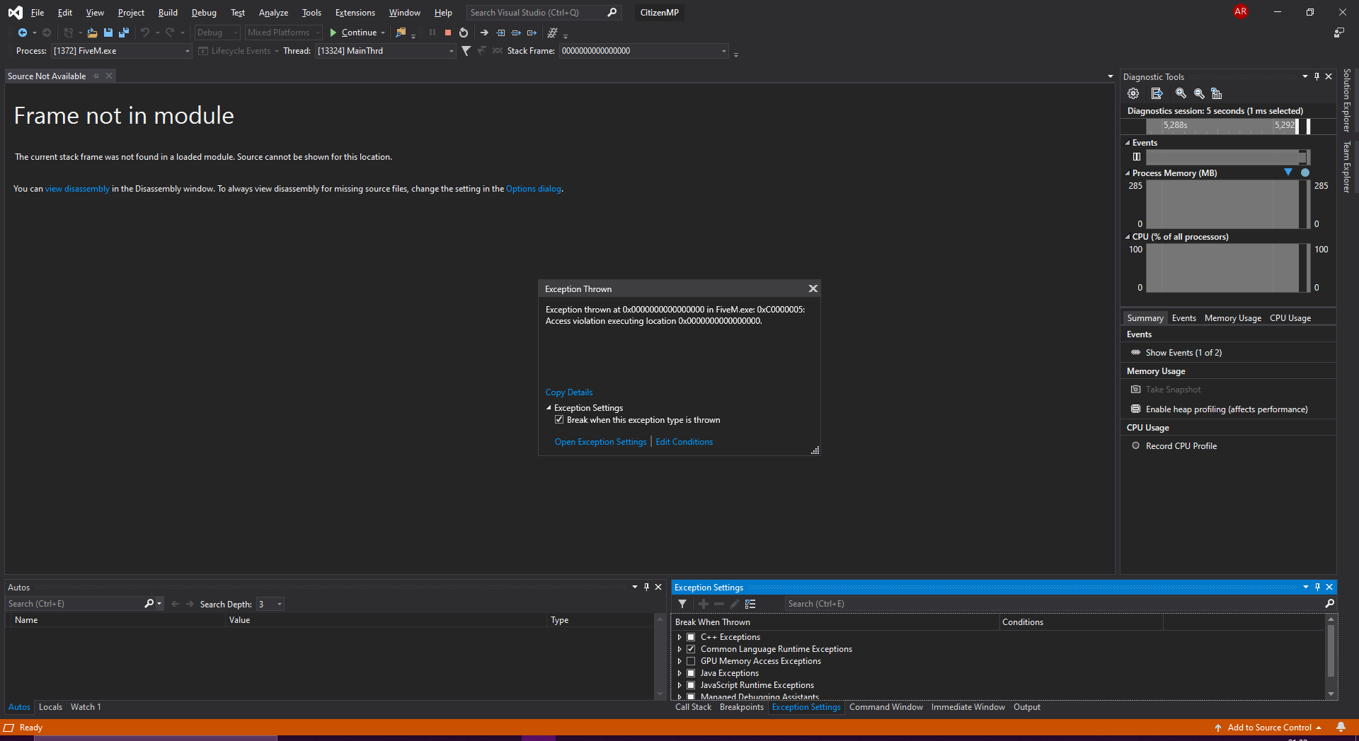 As in the title i successfully built fivem from source. Now i’m trying to debug the code. However the game does not work when running with a debugger attached. What happens is the following: