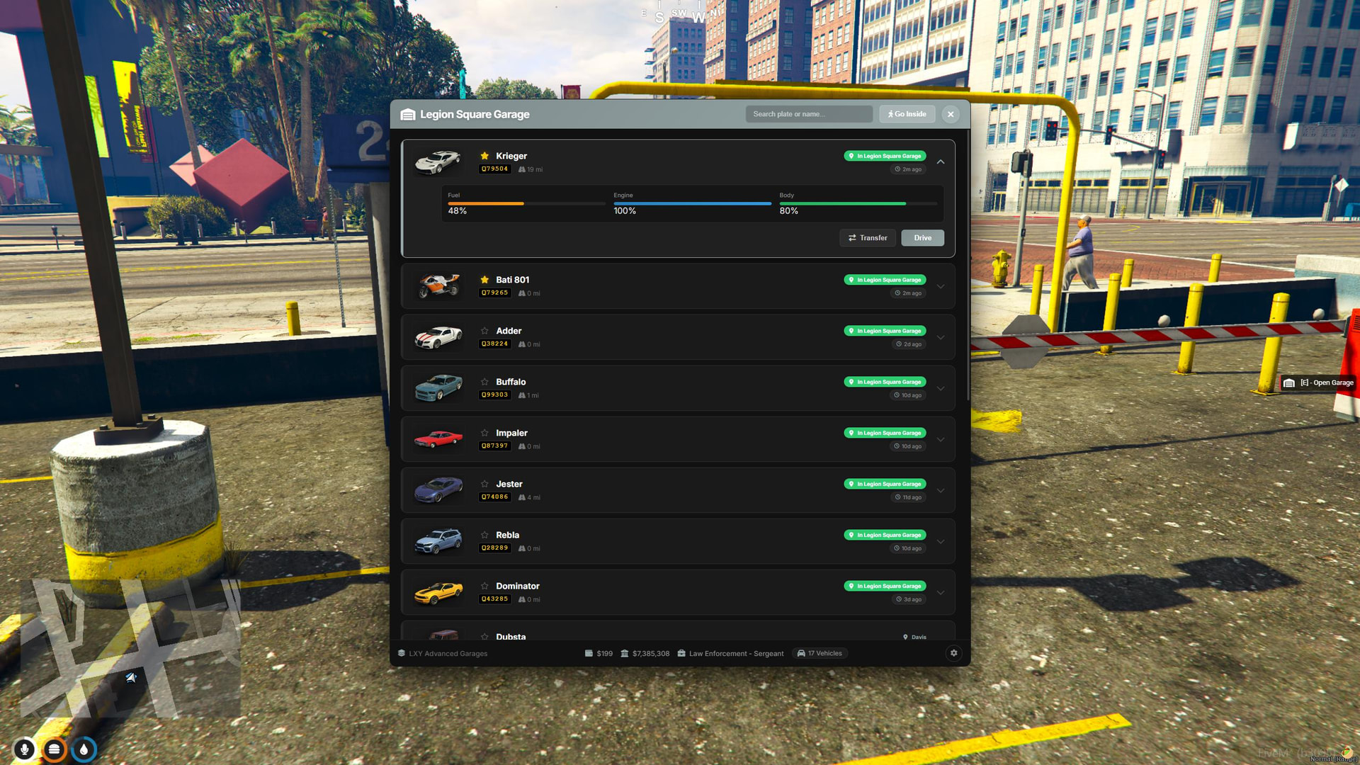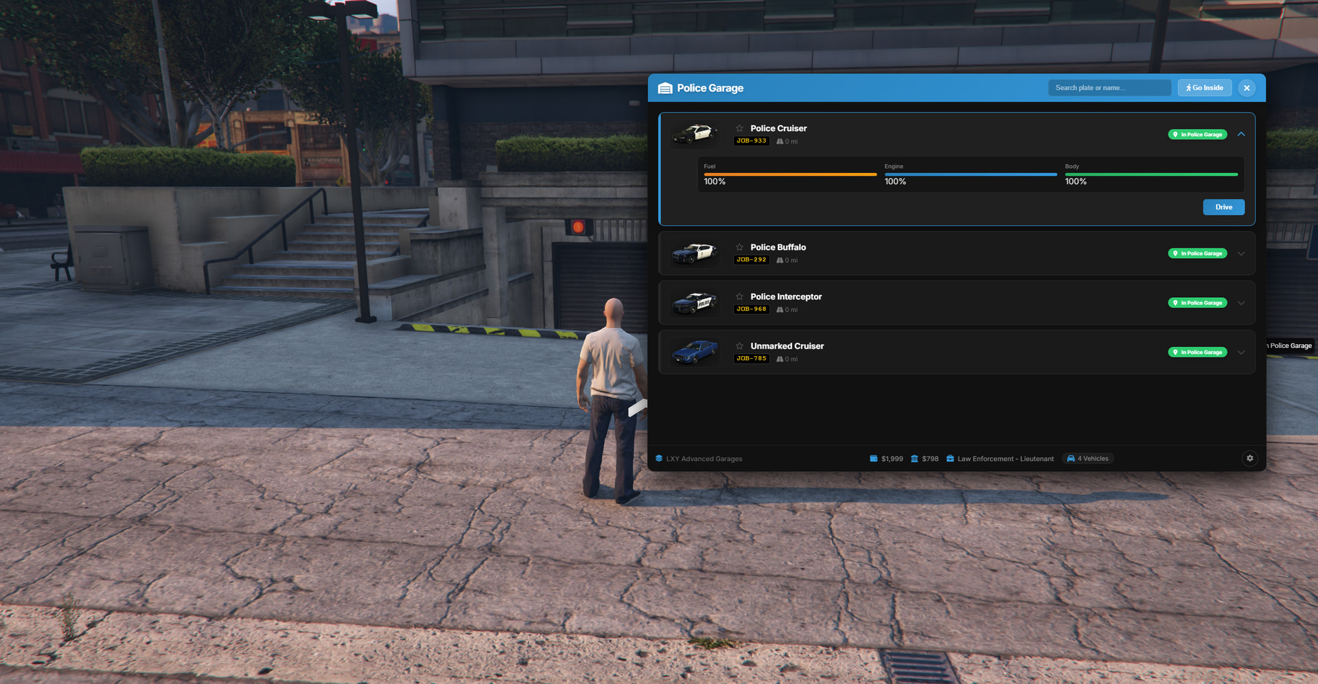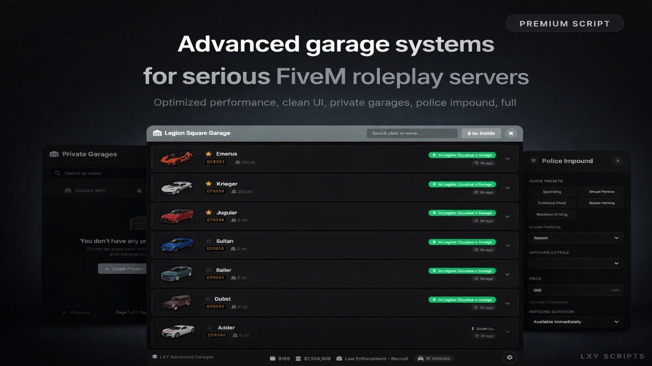LXY Advanced Garages is a complete and modern vehicle management system designed to handle every aspect of garage functionality in your server. It supports public, private, job, gang, aircraft, and boat garages, combined with a powerful and reliable impound system.