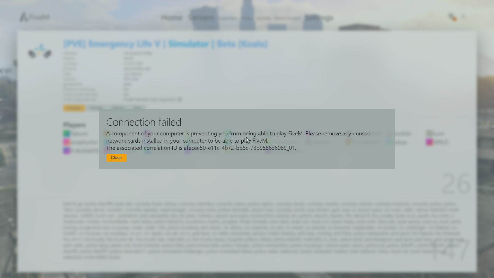 What did you do to get this issue? A component of your computer is preventing you from being able to play FiveM. Please remove any unused network cards installed in your computer to be able to play FiveM. The associated correlation ID is aes50-e11c-4b72-bb8c-73b958636089_01.