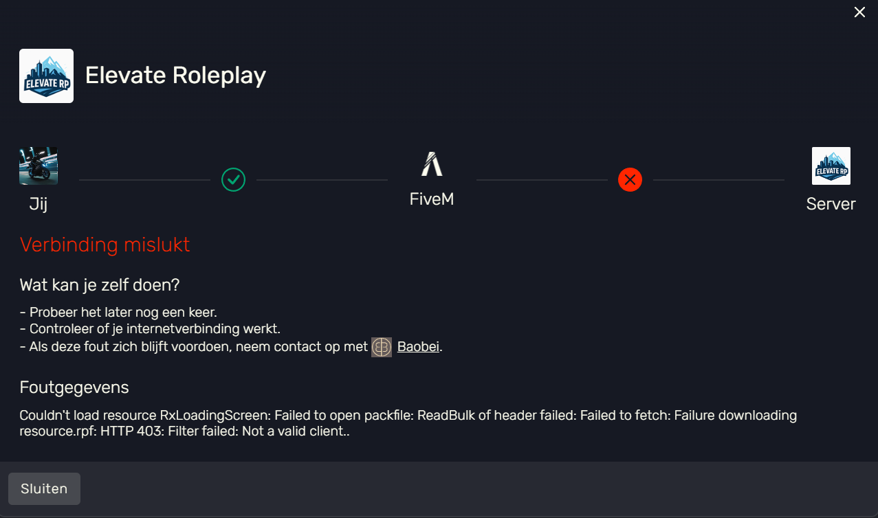 I restarted my whole pc and downloaded everything again because my pc was very slow. Now i updated my nvidia and it all solved like the lag and all that. After a long time i wanted to try to play fivem again so i installed everything put it in gtaV folder (game) and it al worked correct, I installed ARENA and i played it (it worked very well - 250 fps). Now i wanted to join a city but the loading took me for real 4 hours. After it was loaded i got a message (see immage) So i triedf verifying my folders and all that stuff, re install, empty cache, shut the FIVEM down. Everything. But it still don’t work. I tried installing another city and even that one took very long to install and didnt work ( i tried 4 other servers) but 1 server didnt, i could join and it worked fine. It was a RP server so are all otherr 5 i tried. only ARENA and 1 rp server worked. But i want to play my servers and not only 2 or 3. I hope you know why i have this and i hope you can solve it for me. I also contacted baobei and he didnt know why this was such a big problem. I looked for videos on YOUTUBE TIKTOK but still no one had the same problem as i do. I also try to run FIVEM as administrator but it doesnt let me cuz it says that i didnt allow it on my windows setting. So pleaseeee help me!!