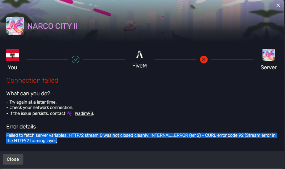 Failed to fetch server variables. HTTP/2 stream 0 was not closed cleanly: INTERNAL_ERROR (err 2) - CURL error code 92 (Stream error in the HTTP/2 framing layer)