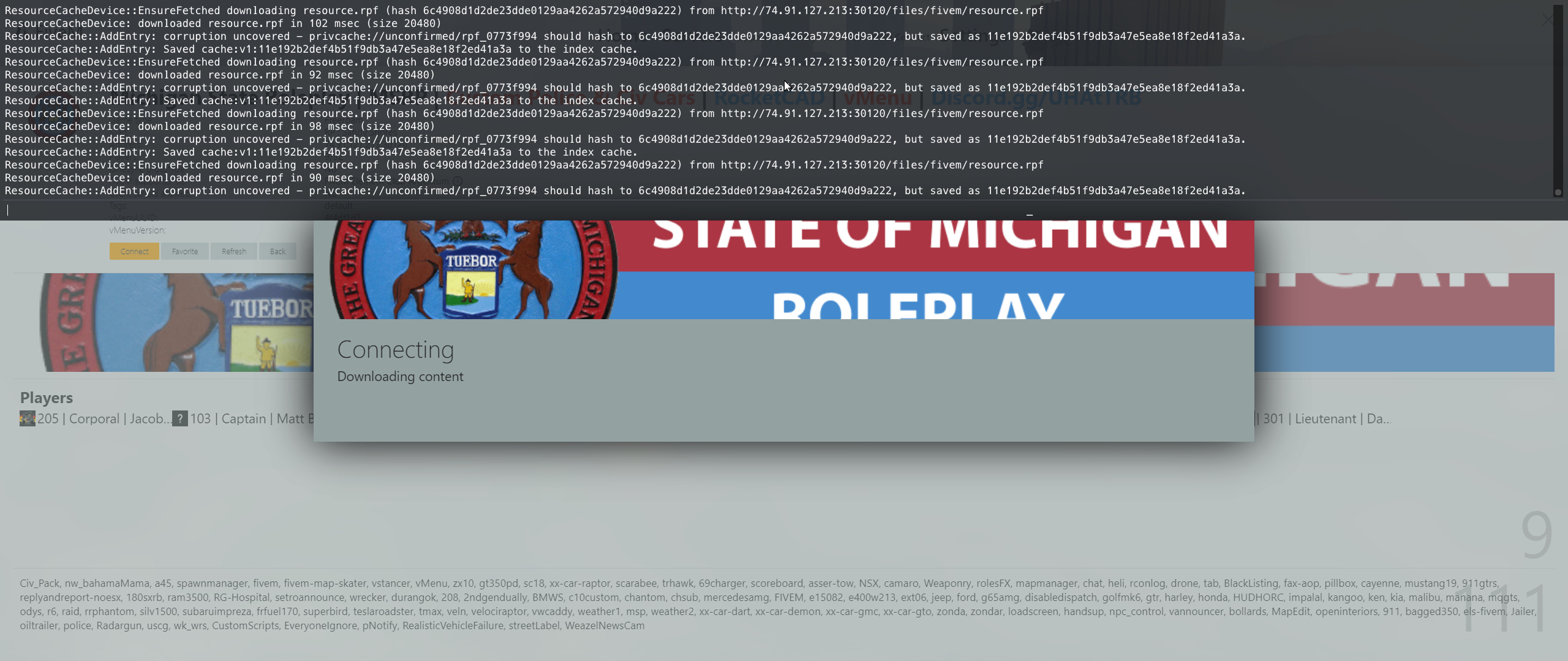 [ 17922] ResourceCacheDevice::EnsureFetched downloading resource.rpf (hash 6c4908d1d2de23dde0129aa4262a572940d9a222) from http://74.91.127.213:30120/files/fivem/resource.rpf