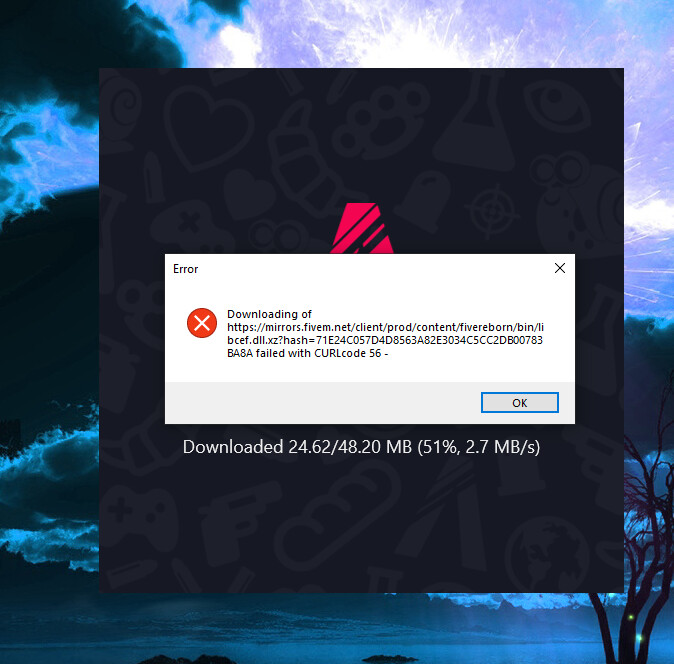 System specifications Intel(R) Core™ i7-7700 CPU @ 3.60GHz and GeForce GTX 1060 6GB What did you do to get this issue? try to instal it What server did you get this issue on? cant get to the servers CitizenFX crash zip file don´t have it CitizenFX.log file don´t have it .dmp files/report IDs don´t have it
