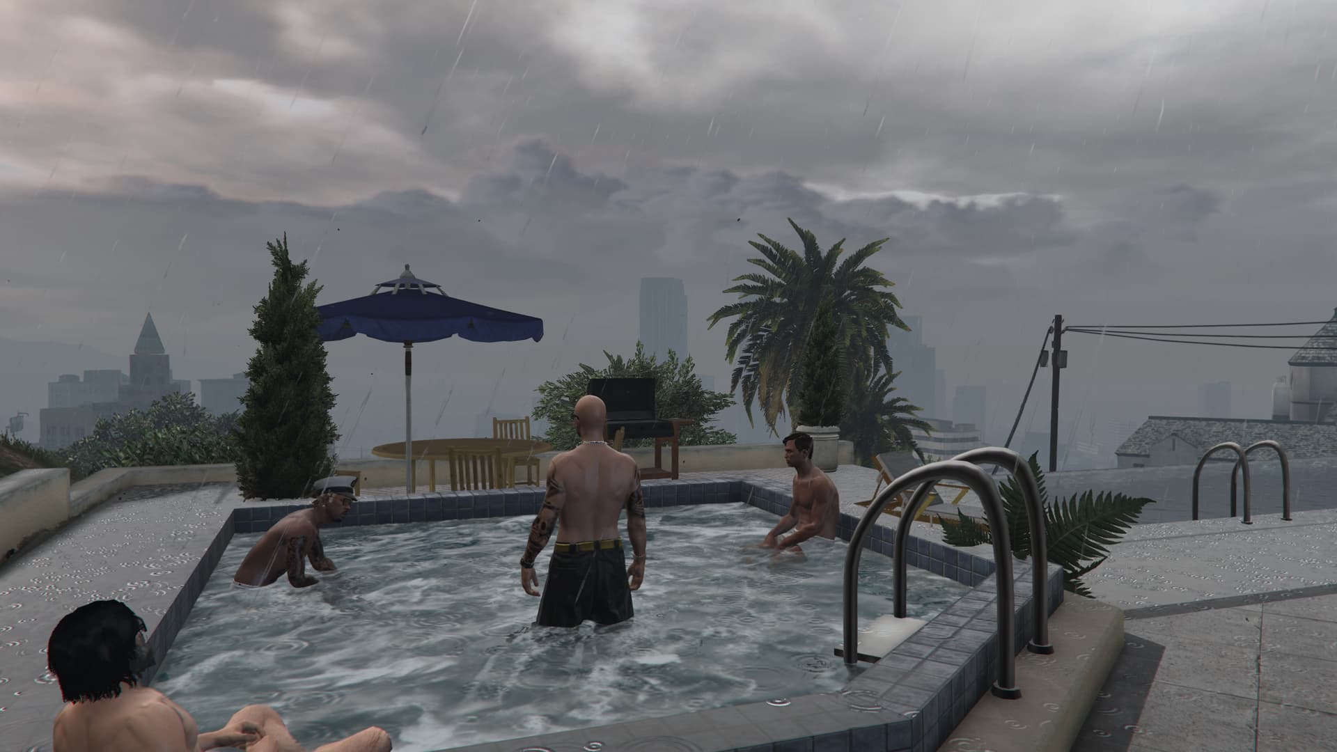 Just a few bros hanging out in the hot tub after a long day of work. The weather isn’t looking too great for this kind of hang out.