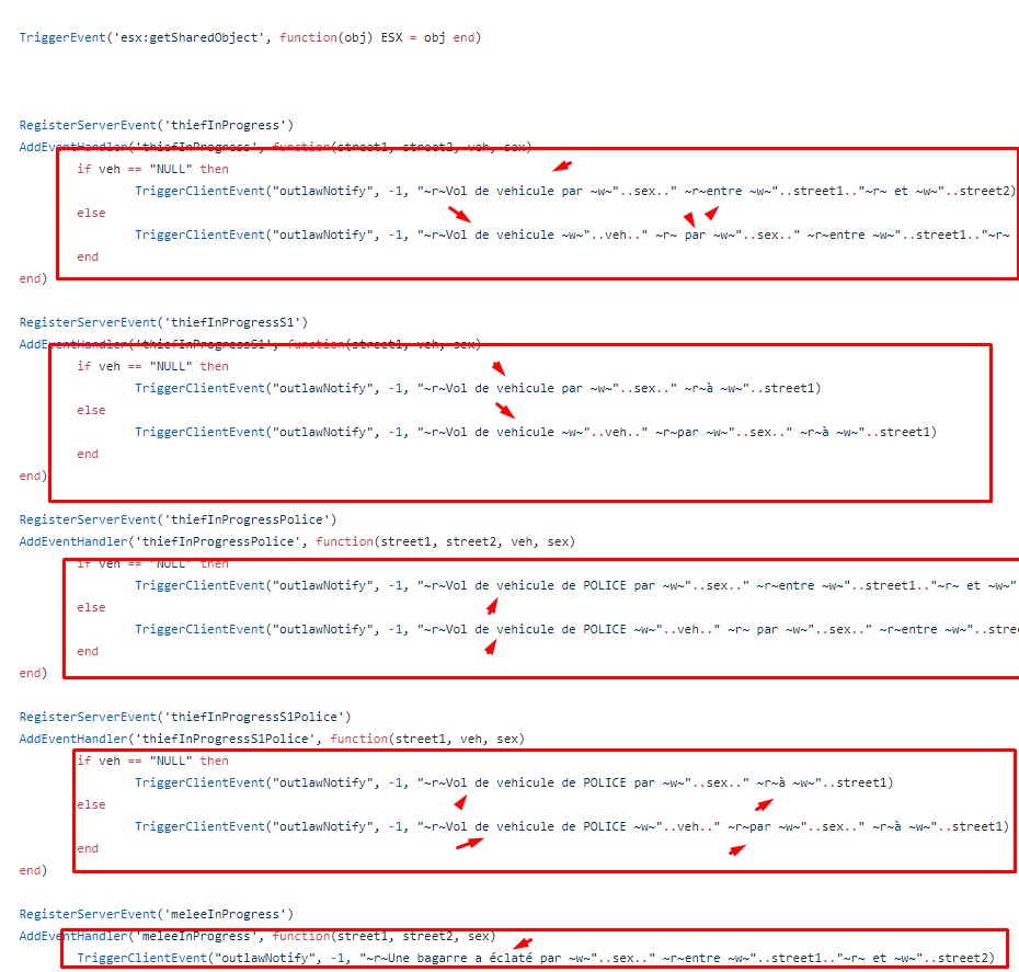 It’s as easy as going to server.lua and finding TriggerClientEvent (“outlawNotify”, -1, “~ r ~ Vol de vehicule de POLICE par ~ w ~” … sex … “~ r ~ à ~ w ~” … street1)