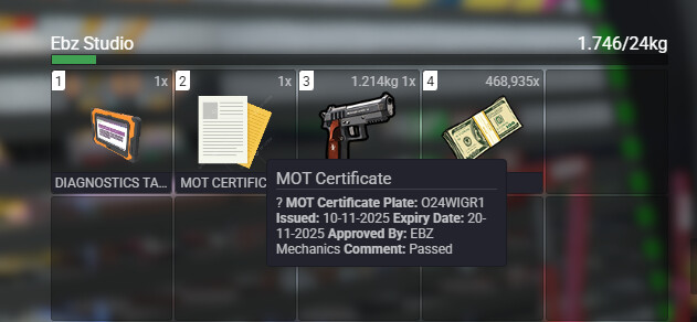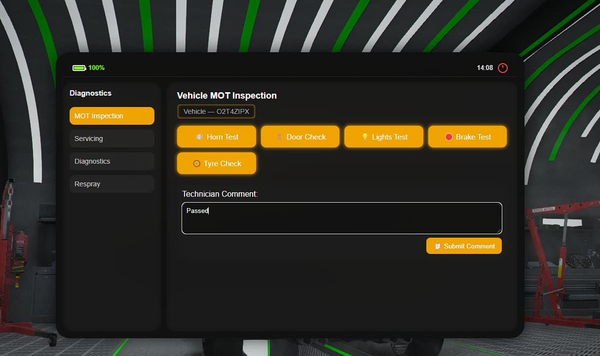 Mechanics can perform detailed inspections, issue official MOT certificates, and law enforcement can verify compliance — adding immersive realism and safety to your server.
