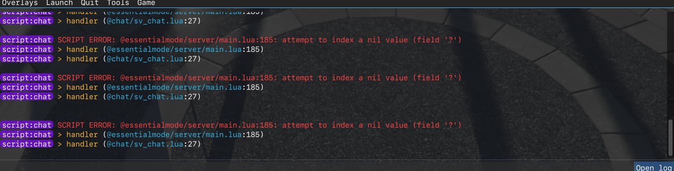 [script:essentialmode] > handler (@chat/sv_chat.lua:27)