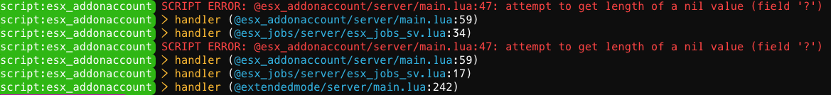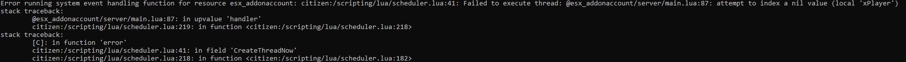 Error running system event handling function for resource esx_addonaccount: citizen:/scripting/lua/scheduler.lua:41: Failed to execute thread: @esx_addonaccount/server/main.lua:71: attempt to index a nil value (local ‘xPlayer’)