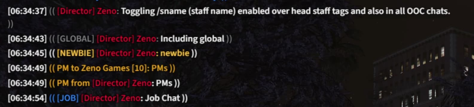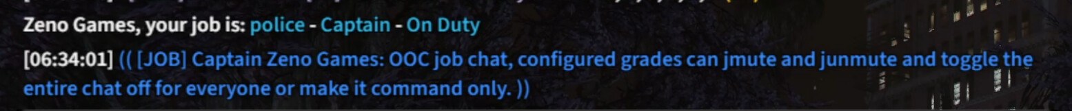 /j- job chat with configurable jobs & grades/togj- toggle job chat/jtoggleall- perm based on grade/jmute&/junmute- perm based on grade / staff rank- Job mutes: