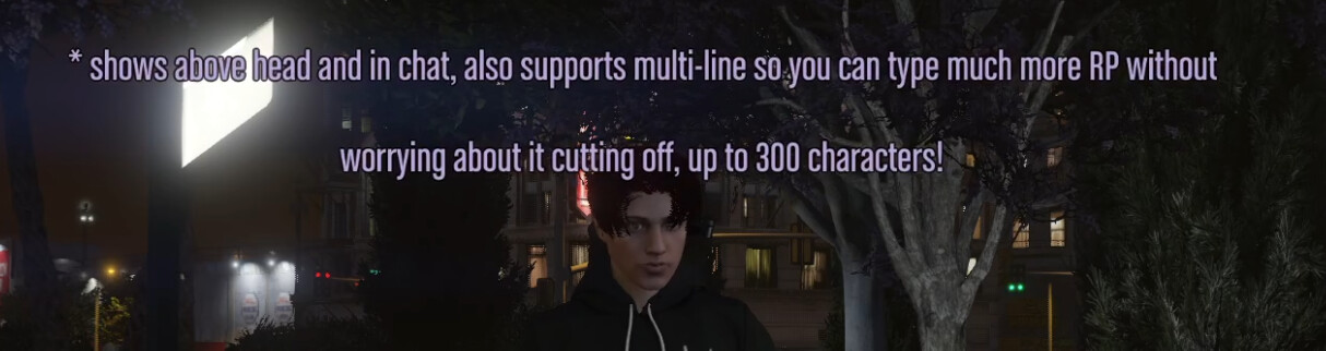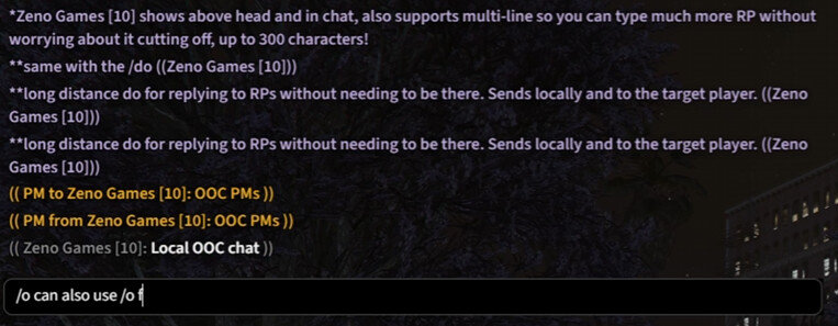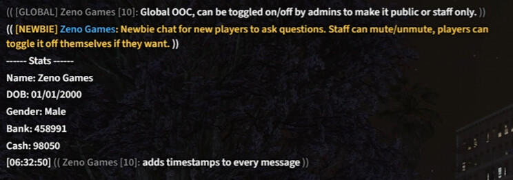 /me&/do- chat + overhead (multi-line, wrapped, scaled)/ame&/ado- overhead only/ldo ID- long-distance RP without global chat/pm- logged OOC private messages/bor/o- local OOC/g- global OOC (staff toggleable)/n- newbie chat (toggleable per player)/stats- character info (name, DOB, gender, bank/cash)/timestamps- optional per-player timestamps/flipcoin&/dice- RP dice & coin flip with overhead emotes