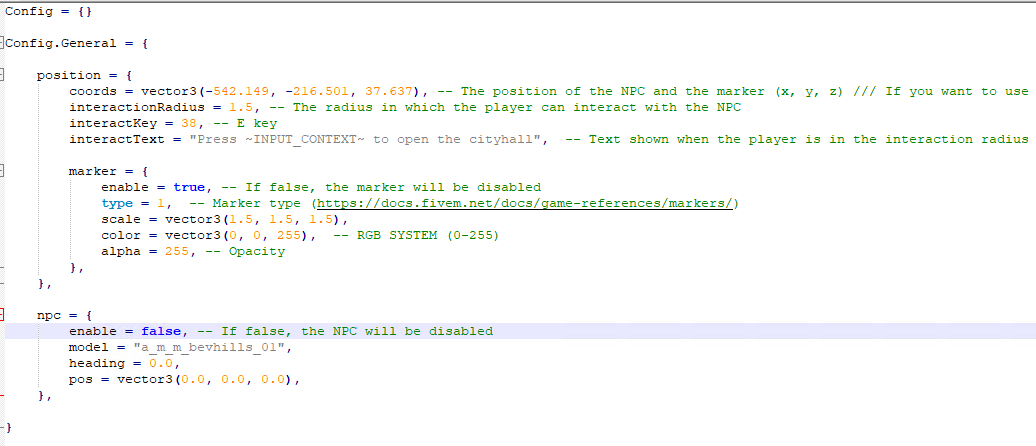 spawnNPC()function. - Added a blip for Cityhall. Configurable via the Config.