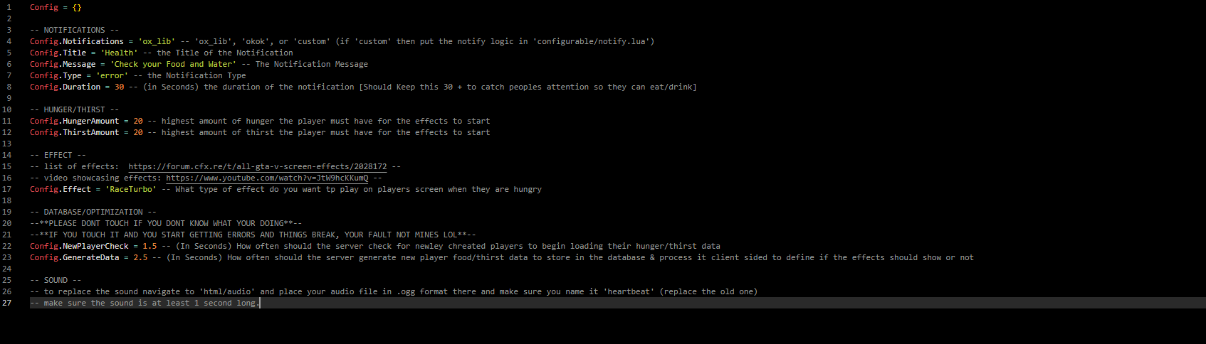 When a player’s food or thirst is below a certain amount (configurable) it will play a constant heartbeat sound & screen effect and gives them a health notification that tells them that they should check their food or water.