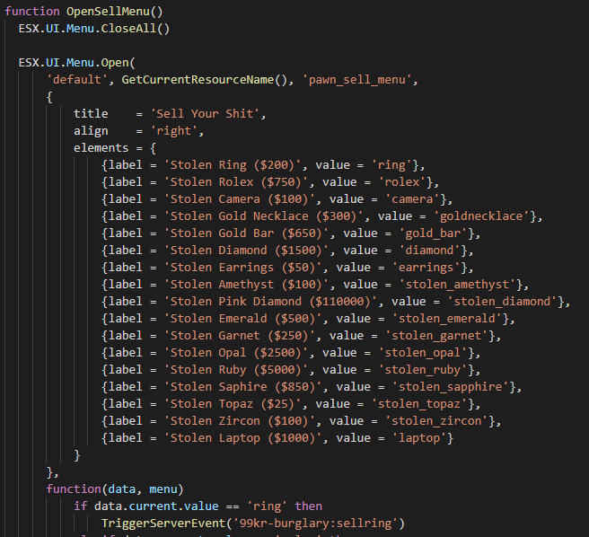 Thnx for giving him a better option then the quick one i found. As far as yours not having a mlo for pawn. You could make that a bit better… by adding a npc… that every time you sell something it does a hand off… so if police are around they see you selling something to the npc (adds a bit of rp chance). I have seen the 99kr script in but never loaded it up or looked into it… but wouldn’t imagine it wouldn’t be to hard to add in a npc and some simple animations.