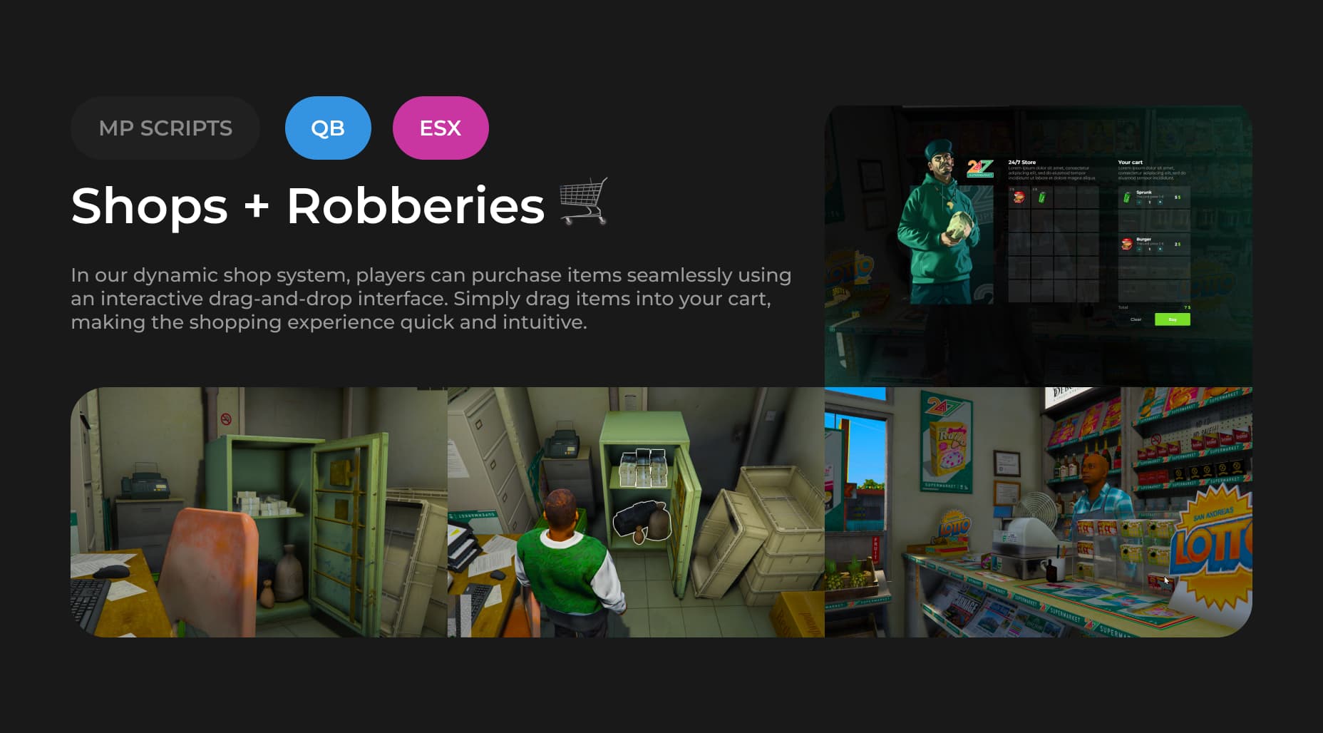 Add an immersive shop and robbery experience to your FiveM server! This script includes drag-and-drop shop interactions and exciting robbery mechanics, bringing extra thrill to roleplay scenarios.