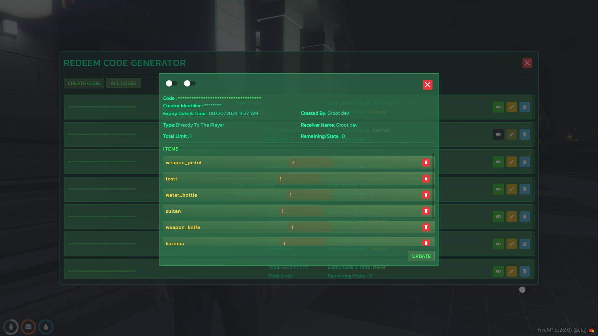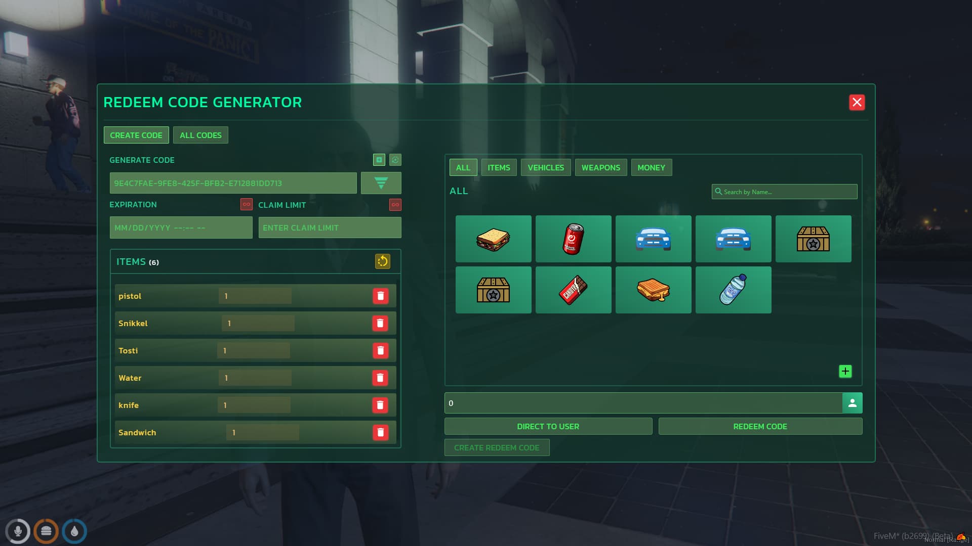This is an advanced redeem code generator script. You can create redeem codes for various items, including weapons, vehicles, and money. You can send redeem codes directly to users or create them globally. Vehicles will be stored in the garage of the person who claimed them. If you are using a custom garage, you can modify it via the bridge. The UI is built with React.js, and you can add more items in the config.lua file