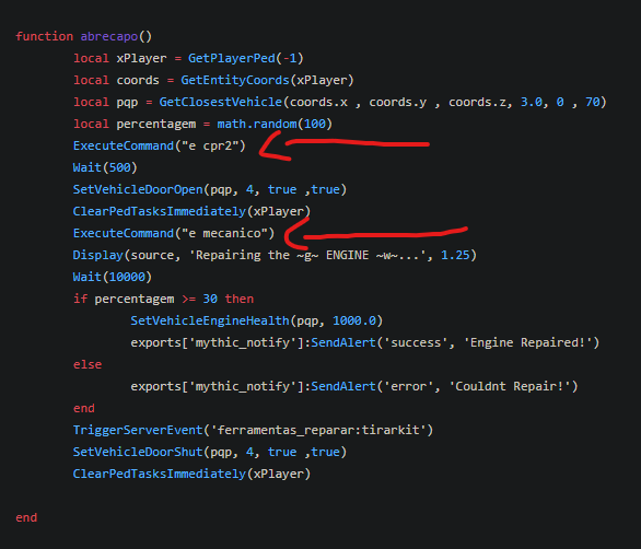 The script is a vehicle repair system, you use the “kit” inside the car, and then go to the hood to repair only the engine