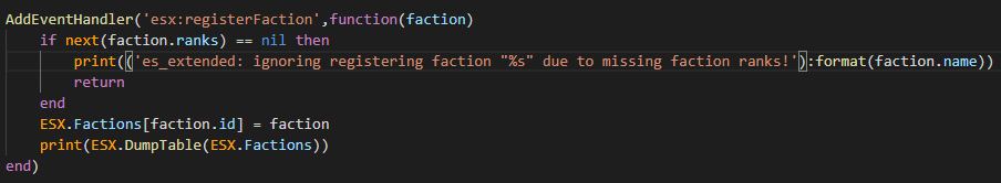 So i’ve been adding a couple of things onto the esx plugin and i added a new table on the ESX object called ESX.Factions. There’s a resource called esx_factions that registers all the factions onto that table using an event, but when i print the table on the esx_factions resource it prints empty, as if i print it in the ESX object when the faction is registered, it prints the table correctly with the faction inside. Any one knows why this happens? I’ll leave prints of my code below.