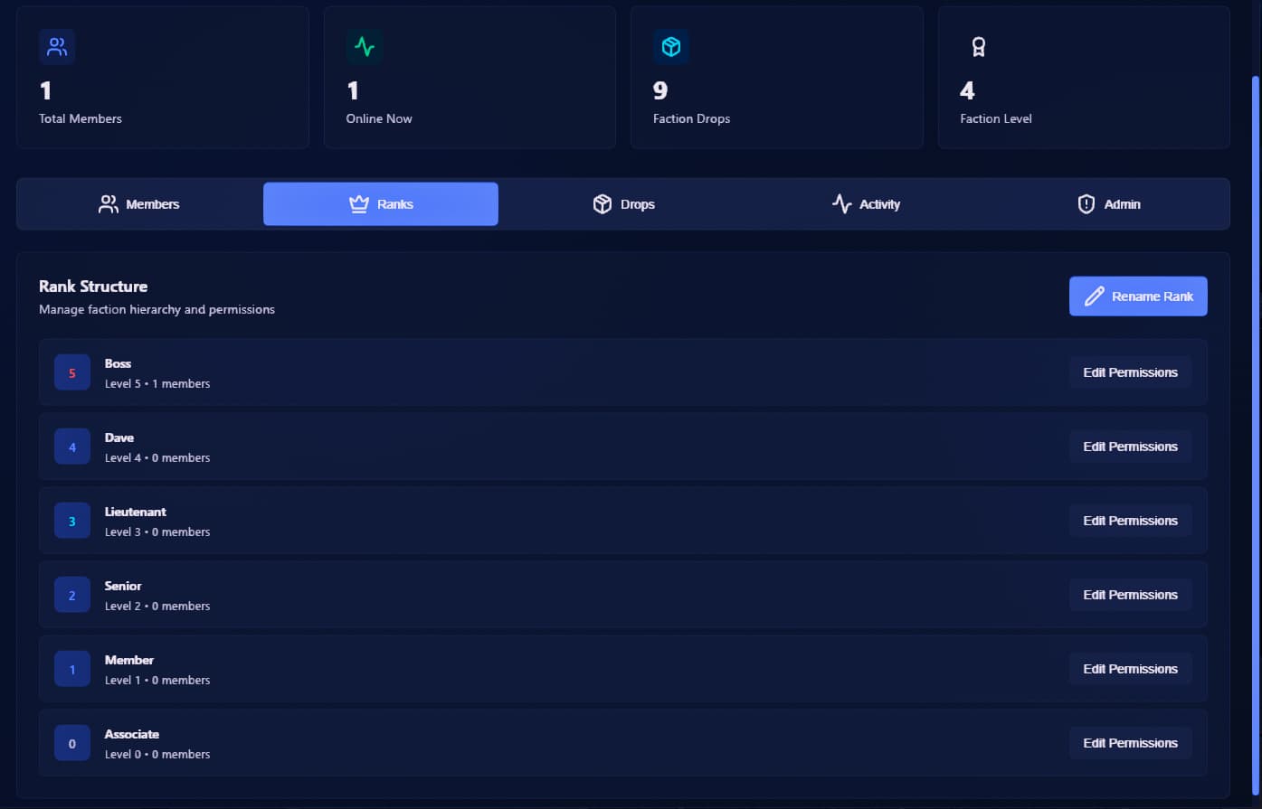 Manage gangs, criminal organizations, and syndicates with a modern UI, rank permissions, drop tiers, admin tools, and real-time data syncing.