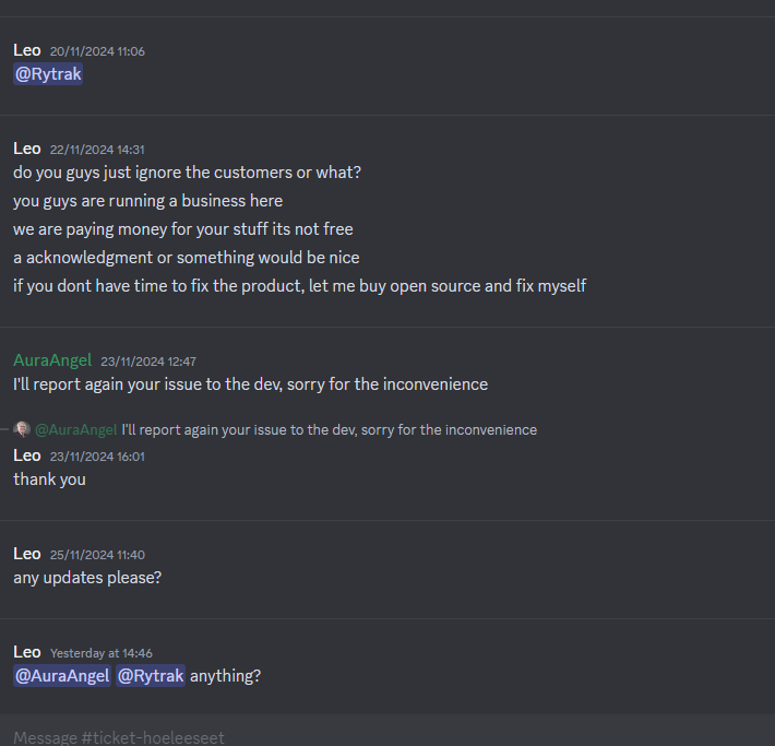 Can’t tell you the amount of time these devs rake in thousands of dollars off of server owners then go completely inactive with their locked scripts we cannot fix as FiveM gets updated constantly and the scripts don’t. Extremely annoying.