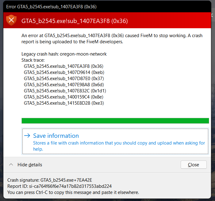 An error at GTA5_b2545.exe!sub_14135A738 (0x48) caused FiveM to stop working. A crash report is being uploaded to the FiveM developers.
