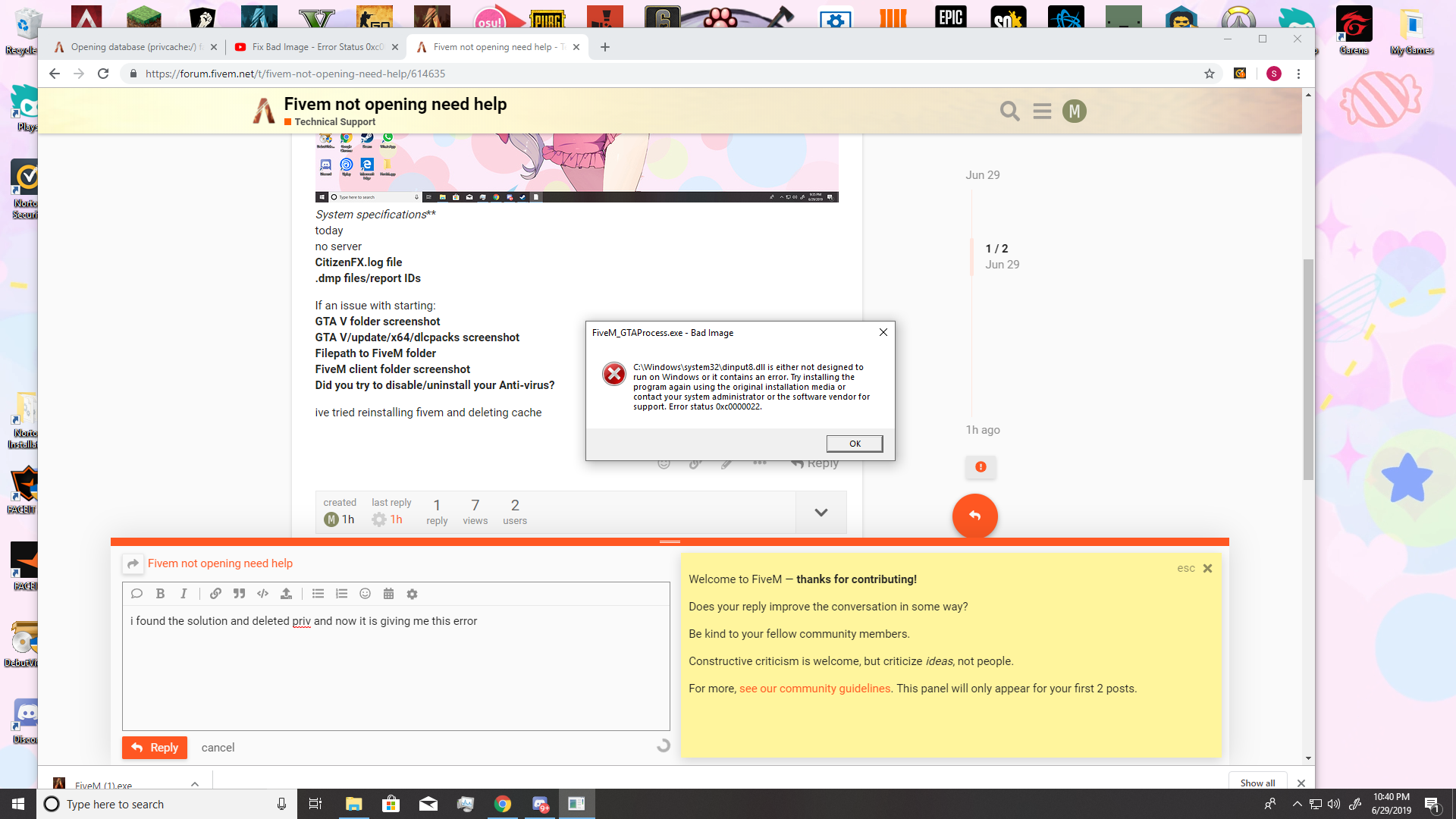 If an issue with starting: GTA V folder screenshot GTA V/update/x64/dlcpacks screenshot Filepath to FiveM folder FiveM client folder screenshot Did you try to disable/uninstall your Anti-virus?