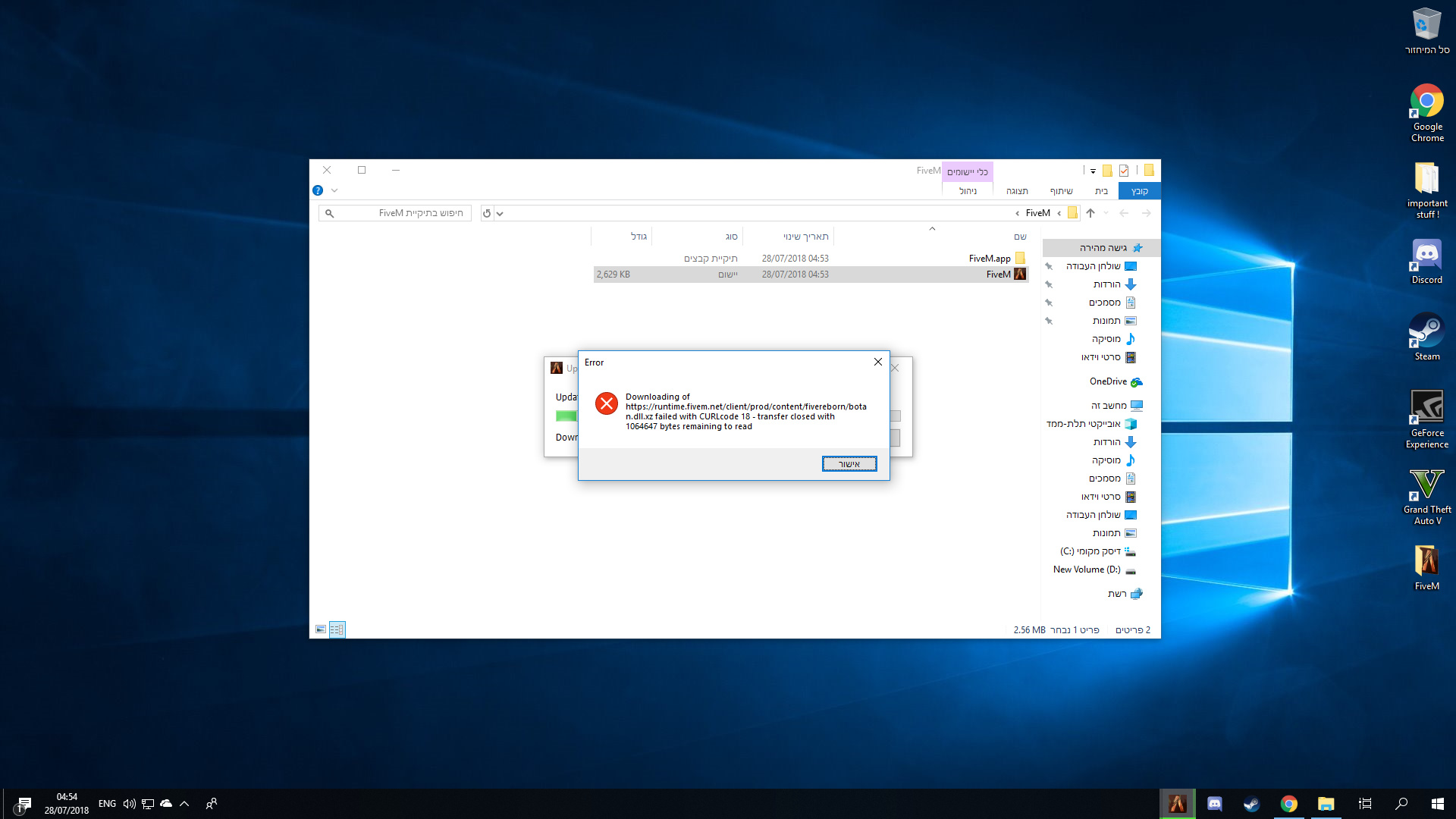 i tried to reinstall gta5 and fiveM||trun off anti virus…||drop ready files to folder||change the FiveM folder between drivers from C to D nothing helps|| even tried to get Ready fiveM folder from friend.