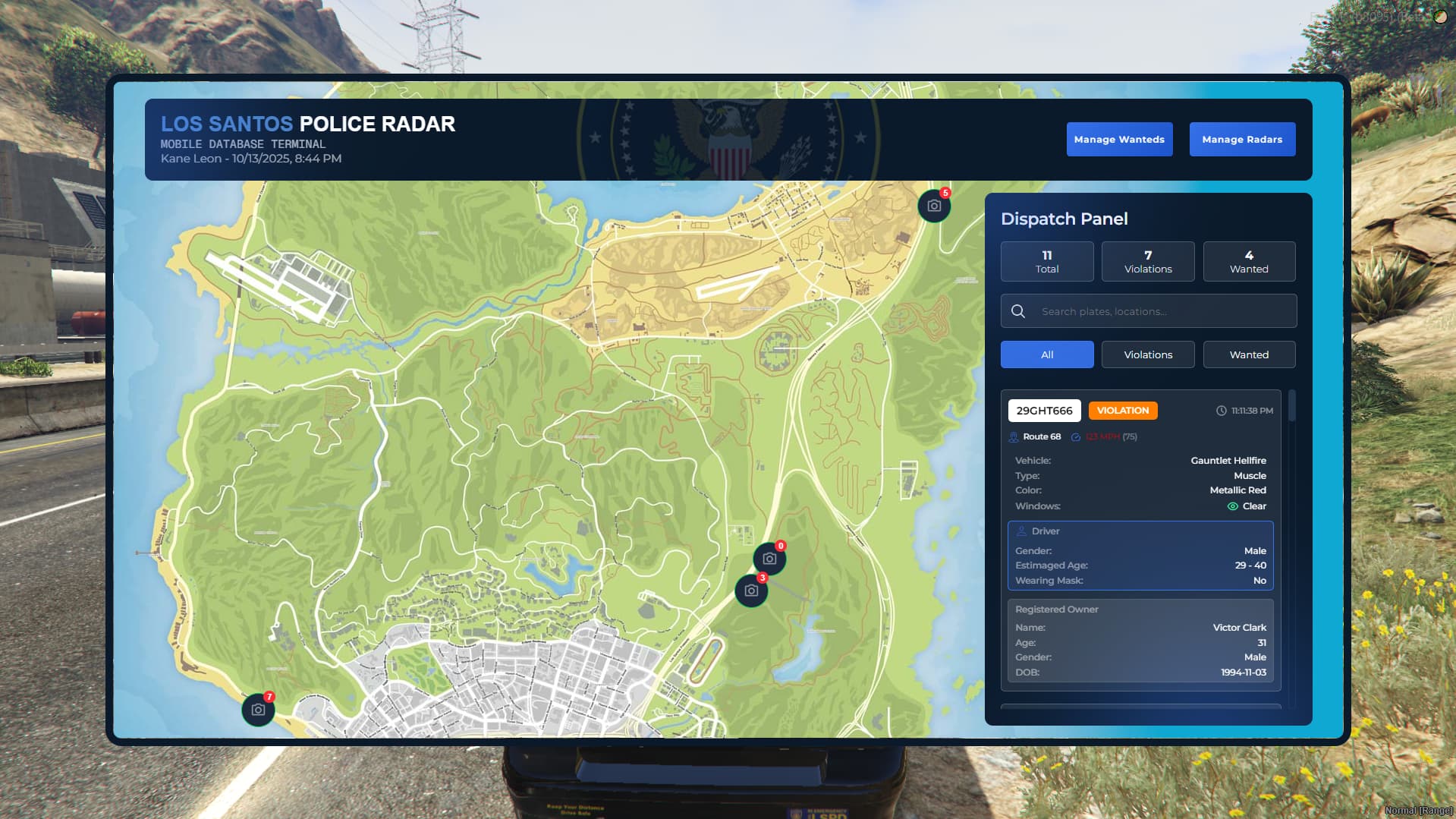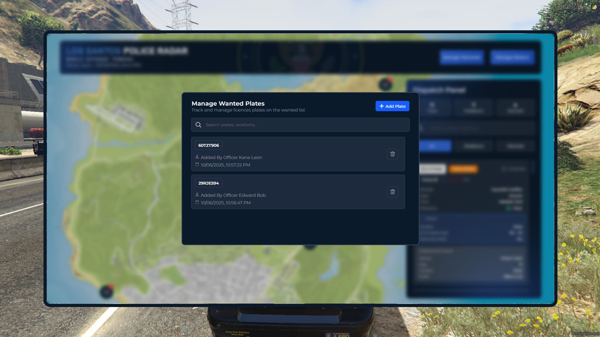 - Wanted Plate System – Officers can mark specific license plates as wanted. If the plate passes through any radar, the system triggers a wanted alert automatically.