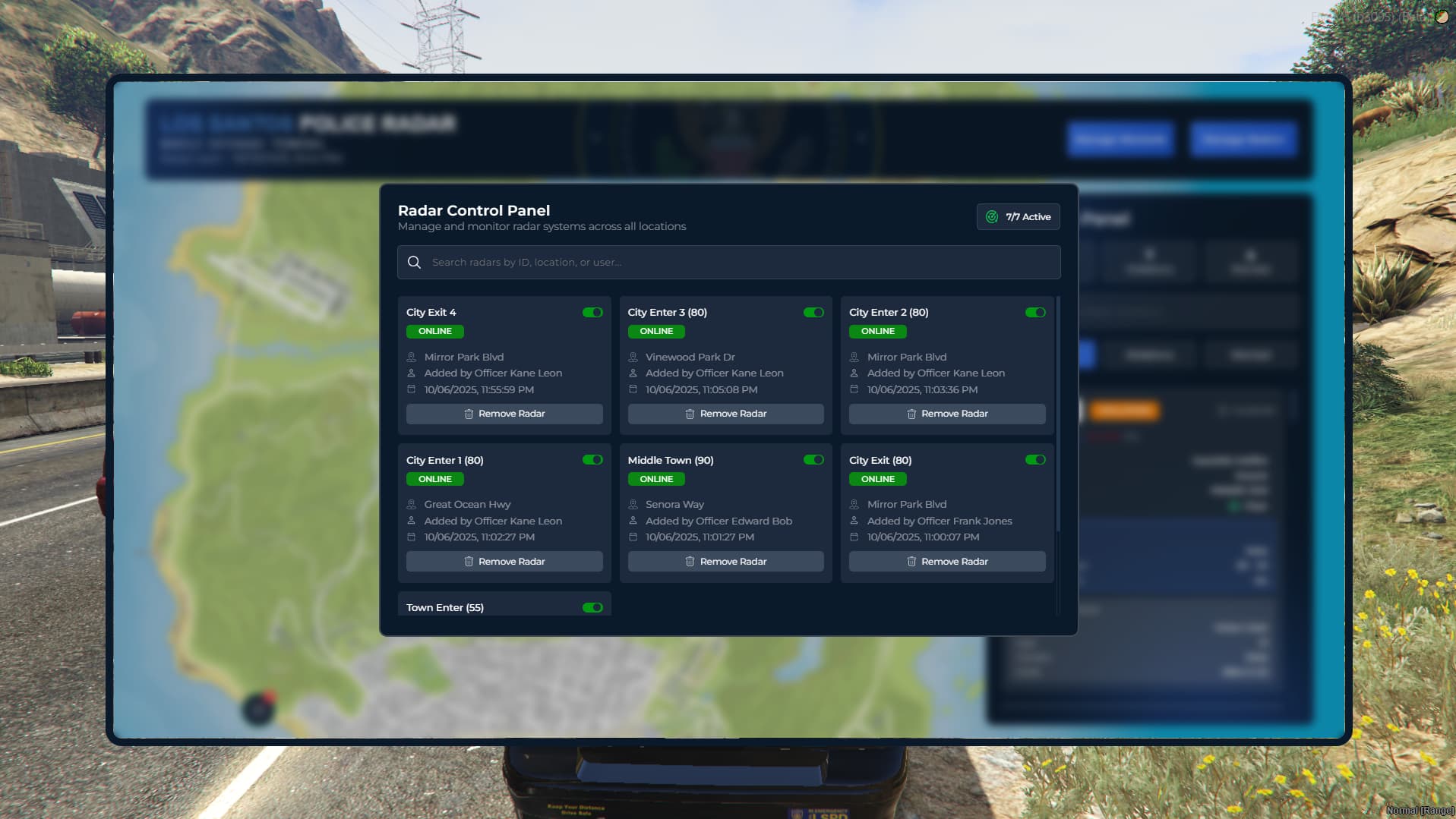 - Placeable Radar Units – Authorized officers can deploy radars anywhere, set custom speed limits, and automatically detect speed violations from passing vehicles.