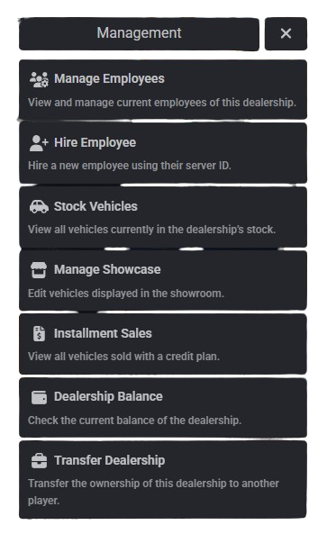 - Unlimited Dealerships – Create as many dealerships as you want, fully managed in-game.