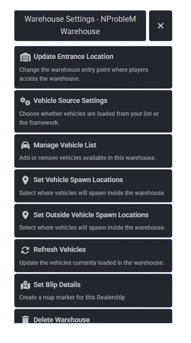 All configurations — from dealership setup to stock management — are handled through an intuitive in-game interface, ensuring a smooth, modern experience for both administrators and players.