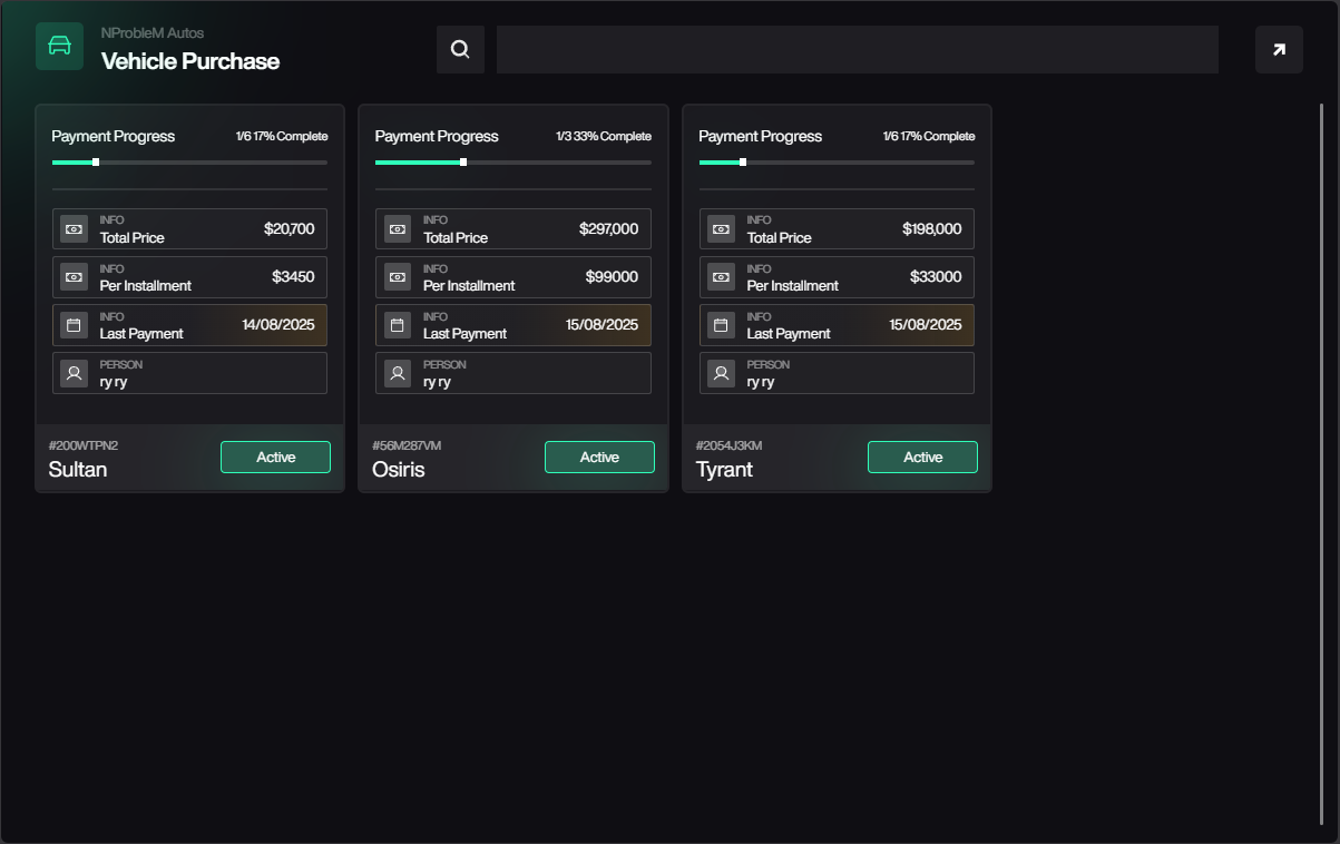 A: Dealerships can offer installment payments for any vehicle. Buyers can track remaining payments, due times, and amounts directly in-game — and can pay early or close the plan anytime. Dealership owners also have access to a dedicated menu showing buyer details, license plate, payment history, and more. -