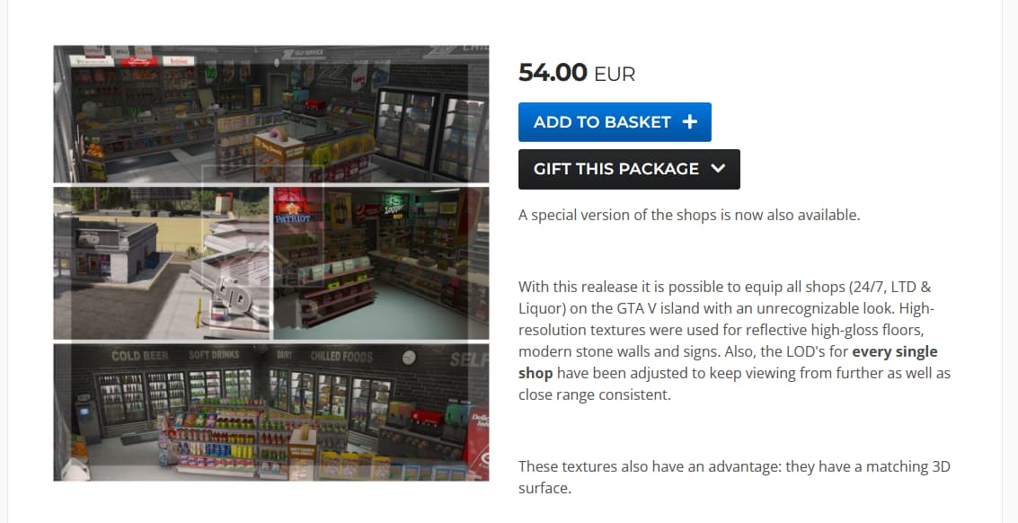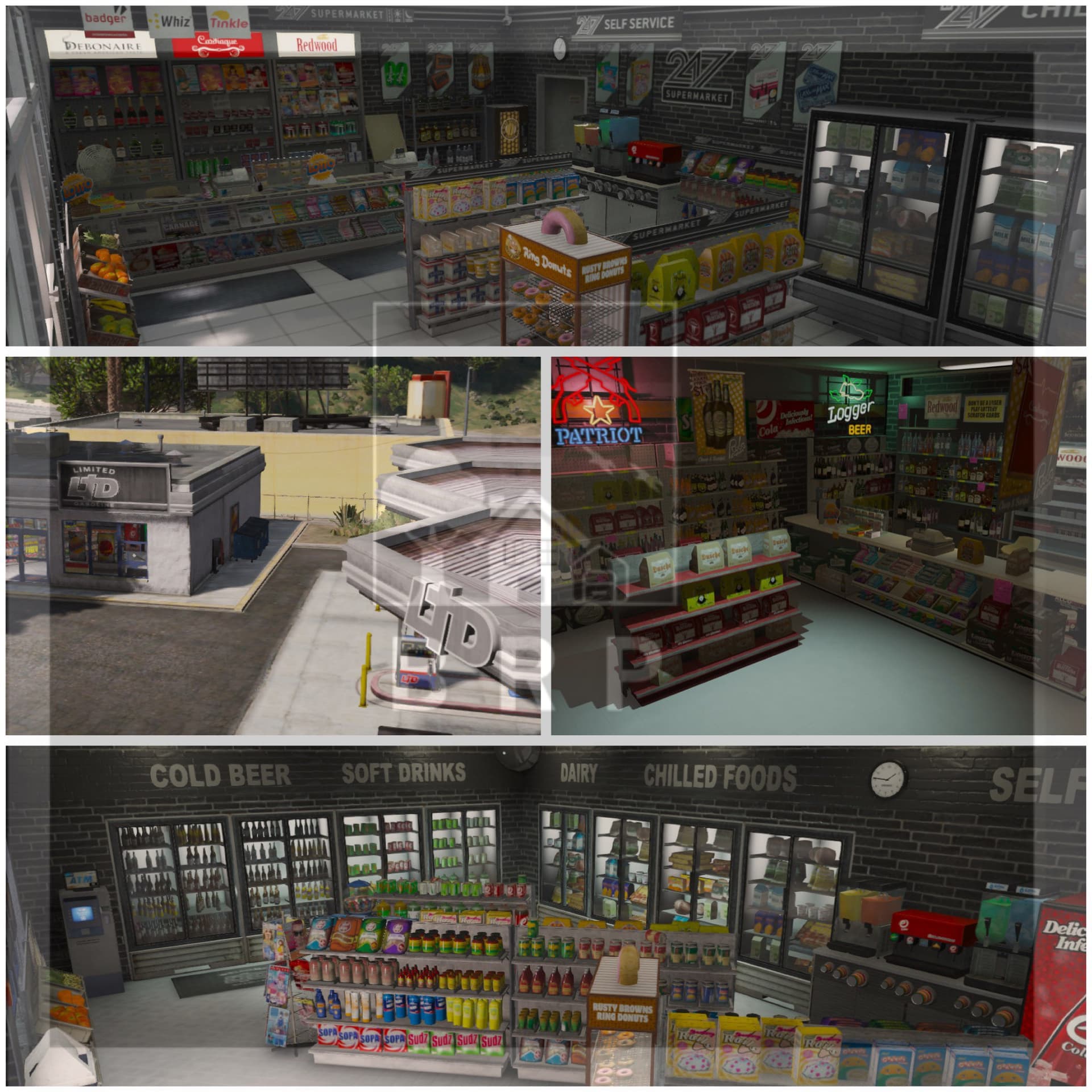 With this realease it is possible to equip all shops (24/7, LTD & Liquor) on the GTA V island with an unrecognizable look. High-resolution textures were used for reflective high-gloss floors, modern stone walls and signs. Also, the LOD’s for every single shop have been adjusted to keep viewing from further as well as close range consistent.