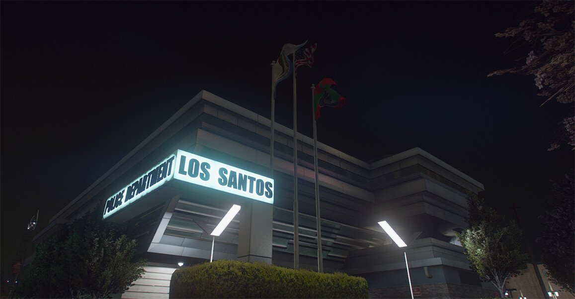 -more flags simulating the IRL police station (LAPD Olympic Station in Los Angeles) (with variations)