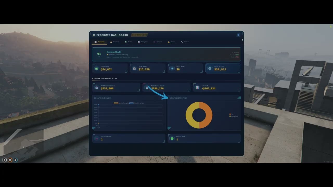 All admin actions (add/remove/set money) are protected by server-side permission checks. The dashboard only opens for players with configured admin permissions, and every money operation validates permissions on the server before executing.