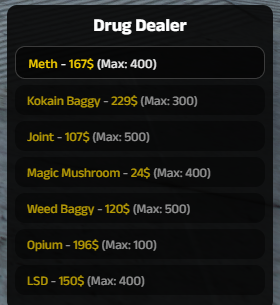Our Drug Selling allows players to sell drugs with a built-in progress bar. It offers numerous configuration options such as police notifications, deal duration, dynamic dealer locations, selection of offered drugs, and fluctuating selling prices. Perfect for immersive and customizable drug deals in RP.