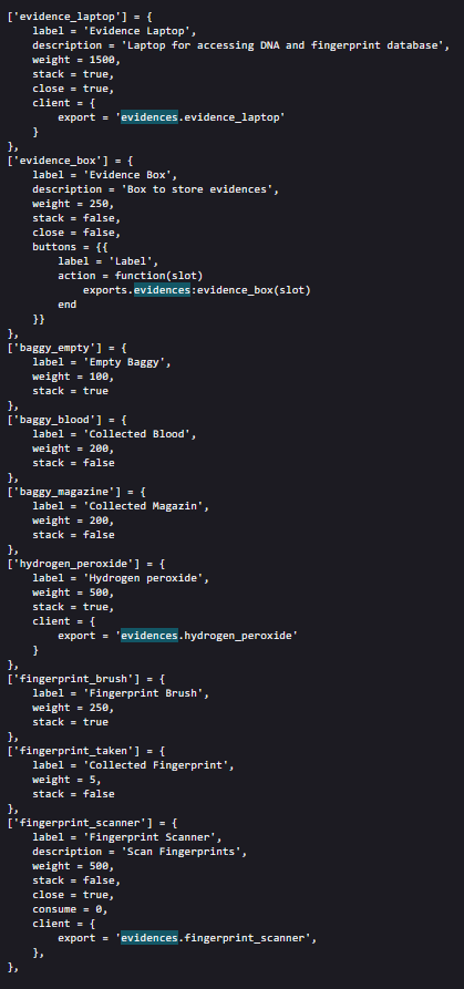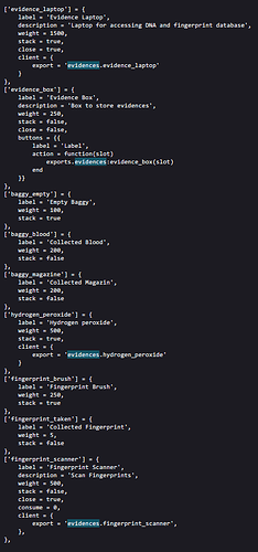 Hey, quick question. I would like to rename the folder ND_Evidence (for organization) but it throws some errors due to non matching folder name or export, any tips on what exactly I need to change in the script and ox invetory’s items.lua